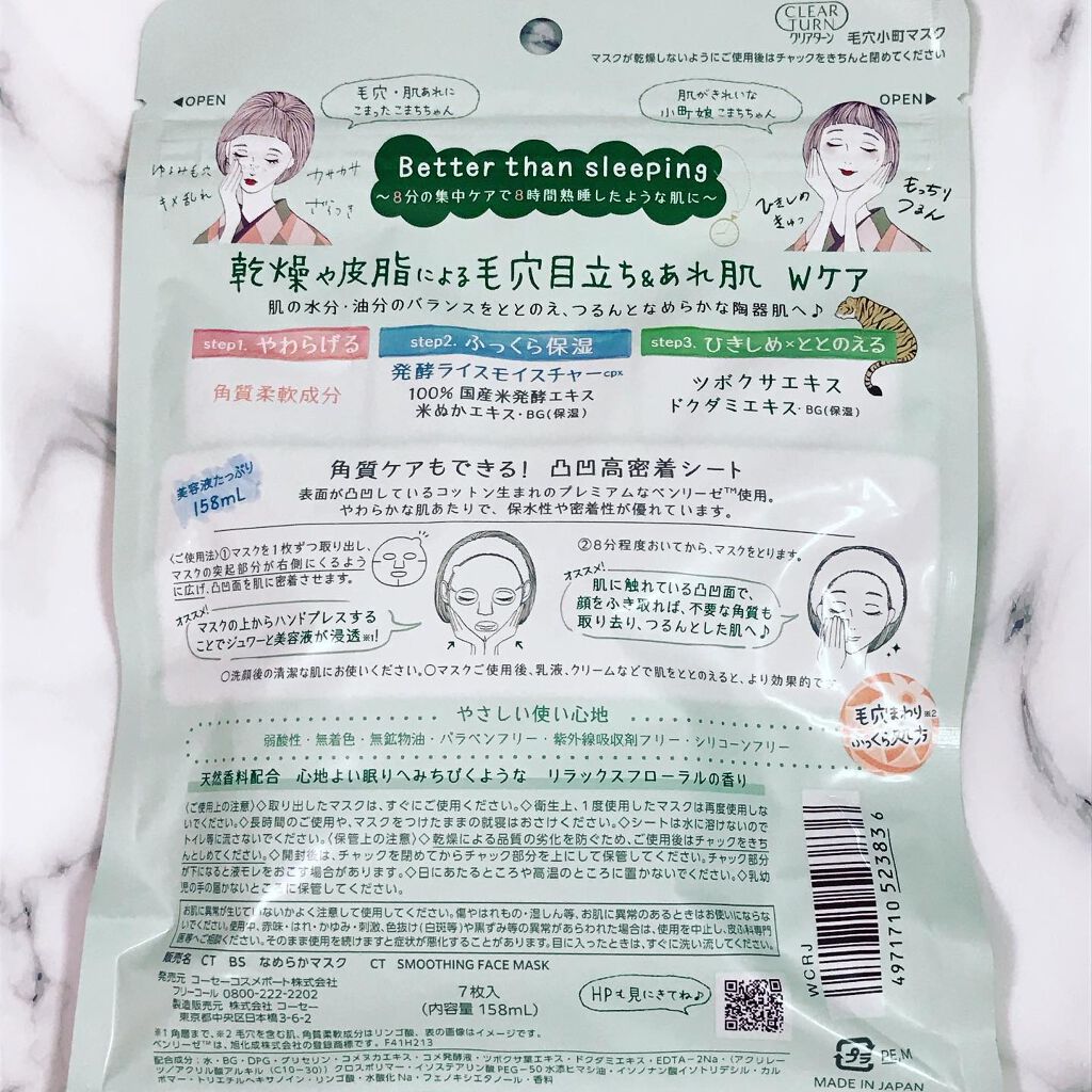 - 毛穴・肌あれが同時にケアできる、毛穴小町マスク! ①毛穴目立ち&肌あれをダブルでケア!なめらか陶器肌へ 水分・油分をバランスよく配合したみずみずしい美容液で、乾燥や皮脂による毛穴目立ちやあれ肌もケアします。キメのととのった、つるんとなめらかな陶器肌に導きます。 角質柔軟成分※3配合。肌をやわらげます。 100%国産米発酵エキス・米ぬかエキス・BG(保湿)をはじめとする発酵ライスモイスチャーCPX配合。ふっくらと保湿します。 ツボクサエキス・ドクダミエキス・BG(保湿)配合。ツボクサエキスは今話題のCICA成分です。肌をひきしめととのえます。 ※3 角質柔軟成分はリンゴ酸 ②角質ケアできる凸凹高密着シート コットン生まれでやわらかな肌触りの国産シートを採用。シートマスクの表面には凸凹のエンボス加工を施しているため、密着性が高く、はがしたマスクでやさしく顔をふきとることで角質ケアもできます。 ③心地よい眠りにみちびくようなリラックスフローラルの香り(天然香料配合) ④やさしい使い心地 弱酸性・無着色・無鉱物油・パラベンフリー・紫外線吸収剤フリー・シリコーンフリーのやさしい使い心地です。