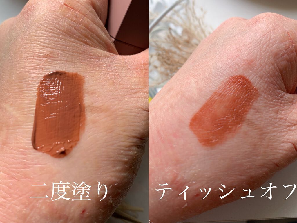 発色がとてもよく、塗った、ティッシュオフしてない状態はブラウンが強い、オレンジリップで秋カラーだなと思いました。 ティッシュオフをすると、控えめな色になり、ナチュラルメイクが好きな方にもいいと思います。ティッシュオフした色が長続きします。※リップクリームを忍ばせておくと色持ちがもっと良くなると公式さんに書いてあります! マットリップですが、乾燥しないです!!サラサラでもペタペタでもなく、その間という感じです。 マスクには付きますが、少しだけです。