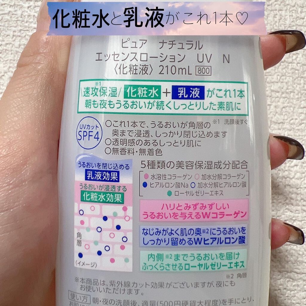 .実力はデパコス並と話題のピュアナチュラルエッセンスローションUVN210ml¥880(税込).化粧水と乳液がこれ1本で済む上にSPF4やけん紫外線対策までできちゃう👀𓈒𓏸デスクチャーはみずみずしくて少量ですっごく伸びる🐑🤍塗るとしっとり…な...