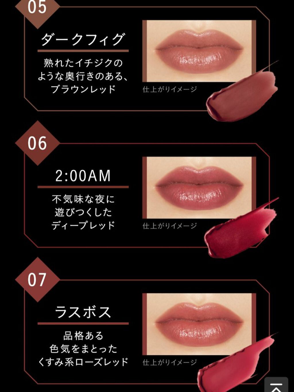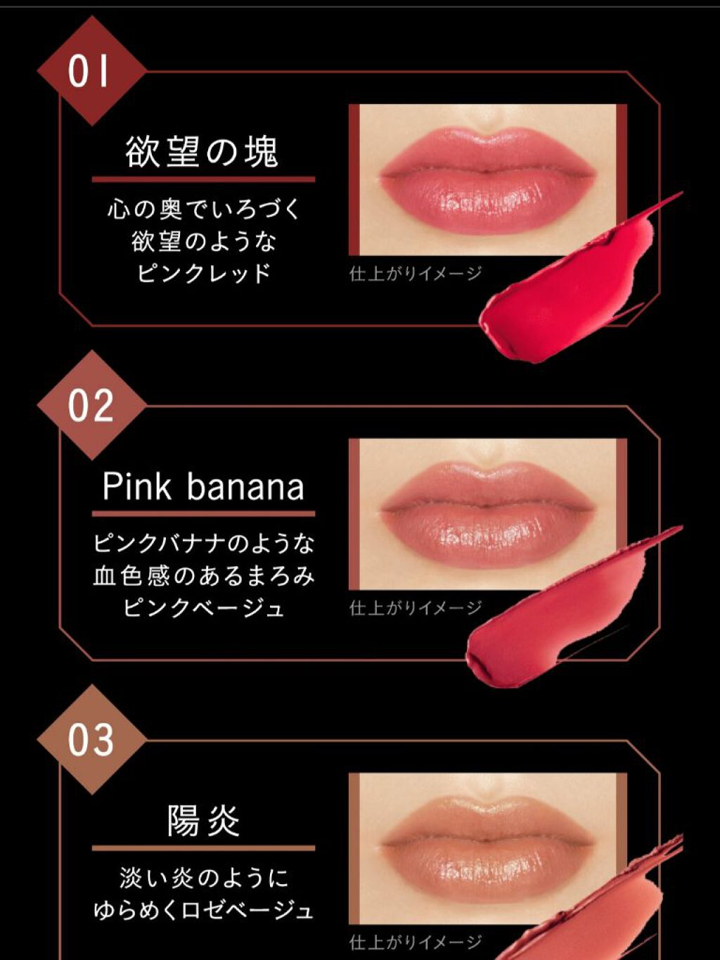- <01 欲望の塊> テトライソステアリン酸ジペンタエリスリチル、トリ(カプリル酸/カプリン酸)グリセリル、オクチルドデカノール、ラウロイルグルタミン酸ジ(フィトステリル/オクチルドデシル)、ビスアルキル(C16-18)グリセリルウンデシルジメチコン、イソノナン酸イソトリデシル、水添ポリイソブテン、ラウロイルグルタミン酸ジ(オクチルドデシル/フィトステリル/ベヘニル)、パラフィン、合成ワックス、ダイマージリノール酸(フィトステリル/イソステアリル/セチル/ステアリル/ベヘニル)、マイクロクリスタリンワックス、水添マイクロクリスタリンワックス、ヒドロキシステアリン酸エチルヘキシル、トコフェロール、ホホバ種子油、オリーブ果実油、アーモンド油、(エチレン/プロピレン)コポリマー、ポリエチレン、ジメチコン、(+/-)(チタン/酸化チタン)焼結物、マイカ、ラウロイルアスパラギン酸Na、ラウロイルリシン、塩化亜鉛、酸化チタン、酸化鉄、水酸化Al、硫酸Ba、トリイソステアリン酸イソプロピルチタン、酸化スズ、ホウケイ酸(Ca/Al)、合成フルオロフロゴパイト、黄4、黄5、赤104(1)、赤201、赤202 <02 ピンクバナナ> テトライソステアリン酸ジペンタエリスリチル、トリ(カプリル酸/カプリン酸)グリセリル、オクチルドデカノール、ラウロイルグルタミン酸ジ(フィトステリル/オクチルドデシル)、ビスアルキル(C16-18)グリセリルウンデシルジメチコン、イソノナン酸イソトリデシル、水添ポリイソブテン、ラウロイルグルタミン酸ジ(オクチルドデシル/フィトステリル/ベヘニル)、パラフィン、合成ワックス、ダイマージリノール酸(フィトステリル/イソステアリル/セチル/ステアリル/ベヘニル)、マイクロクリスタリンワックス、水添マイクロクリスタリンワックス、ヒドロキシステアリン酸エチルヘキシル、トコフェロール、ホホバ種子油、オリーブ果実油、アーモンド油、(エチレン/プロピレン)コポリマー、ポリエチレン、ジメチコン、(+/-)(チタン/酸化チタン)焼結物、マイカ、ラウロイルアスパラギン酸Na、ラウロイルリシン、塩化亜鉛、酸化チタン、酸化鉄、水酸化Al、硫酸Ba、トリイソステアリン酸イソプロピルチタン、酸化スズ、ホウケイ酸(Ca/Al)、合成フルオロフロゴパイト、黄4、黄5、赤104(1)、赤201、赤202 <03 陽炎> テトライソステアリン酸ジペンタエリスリチル、トリ(カプリル酸/カプリン酸)グリセリル、オクチルドデカノール、ラウロイルグルタミン酸ジ(フィトステリル/オクチルドデシル)、ビスアルキル(C16-18)グリセリルウンデシルジメチコン、イソノナン酸イソトリデシル、水添ポリイソブテン、ラウロイルグルタミン酸ジ(オクチルドデシル/フィトステリル/ベヘニル)、パラフィン、合成ワックス、ダイマージリノール酸(フィトステリル/イソステアリル/セチル/ステアリル/ベヘニル)、マイクロクリスタリンワックス、水添マイクロクリスタリンワックス、ヒドロキシステアリン酸エチルヘキシル、トコフェロール、ホホバ種子油、オリーブ果実油、アーモンド油、(エチレン/プロピレン)コポリマー、ポリエチレン、ジメチコン、(+/-)(チタン/酸化チタン)焼結物、マイカ、ラウロイルアスパラギン酸Na、ラウロイルリシン、塩化亜鉛、酸化チタン、酸化鉄、水酸化Al、硫酸Ba、トリイソステアリン酸イソプロピルチタン、酸化スズ、ホウケイ酸(Ca/Al)、合成フルオロフロゴパイト、黄4、黄5、赤104(1)、赤201、赤202 <04 パンプキンワイン> テトライソステアリン酸ジペンタエリスリチル、トリ(カプリル酸/カプリン酸)グリセリル、オクチルドデカノール、ラウロイルグルタミン酸ジ(フィトステリル/オクチルドデシル)、ビスアルキル(C16-18)グリセリルウンデシルジメチコン、イソノナン酸イソトリデシル、水添ポリイソブテン、ラウロイルグルタミン酸ジ(オクチルドデシル/フィトステリル/ベヘニル)、パラフィン、合成ワックス、ダイマージリノール酸(フィトステリル/イソステアリル/セチル/ステアリル/ベヘニル)、マイクロクリスタリンワックス、水添マイクロクリスタリンワックス、ヒドロキシステアリン酸エチルヘキシル、トコフェロール、ホホバ種子油、オリーブ果実油、アーモンド油、(エチレン/プロピレン)コポリマー、ポリエチレン、ジメチコン、(+/-)(チタン/酸化チタン)焼結物、マイカ、ラウロイルアスパラギン酸Na、ラウロイルリシン、塩化亜鉛、酸化チタン、酸化鉄、水酸化Al、硫酸Ba、トリイソステアリン酸イソプロピルチタン、酸化スズ、ホウケイ酸(Ca/Al)、合成フルオロフロゴパイト、黄4、黄5、赤104(1)、赤201、赤202 <05 ダークフィグ> テトライソステアリン酸ジペンタエリスリチル、トリ(カプリル酸/カプリン酸)グリセリル、オクチルドデカノール、ラウロイルグルタミン酸ジ(フィトステリル/オクチルドデシル)、ビスアルキル(C16-18)グリセリルウンデシルジメチコン、イソノナン酸イソトリデシル、水添ポリイソブテン、ラウロイルグルタミン酸ジ(オクチルドデシル/フィトステリル/ベヘニル)、