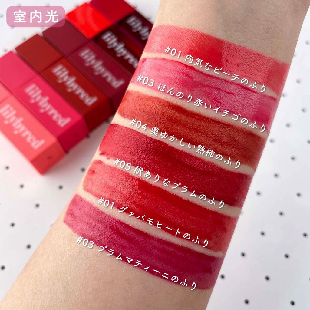 🌻1本500円で買えたlilybyred🌻・ブラッディライアーコーティングティント03クレバーマンガップル・ムードライアーベルベットティント08メロウソフトパーシモン・ジューシーライアーウォーターティント01グアバモヒート質感の違う3種類を選...