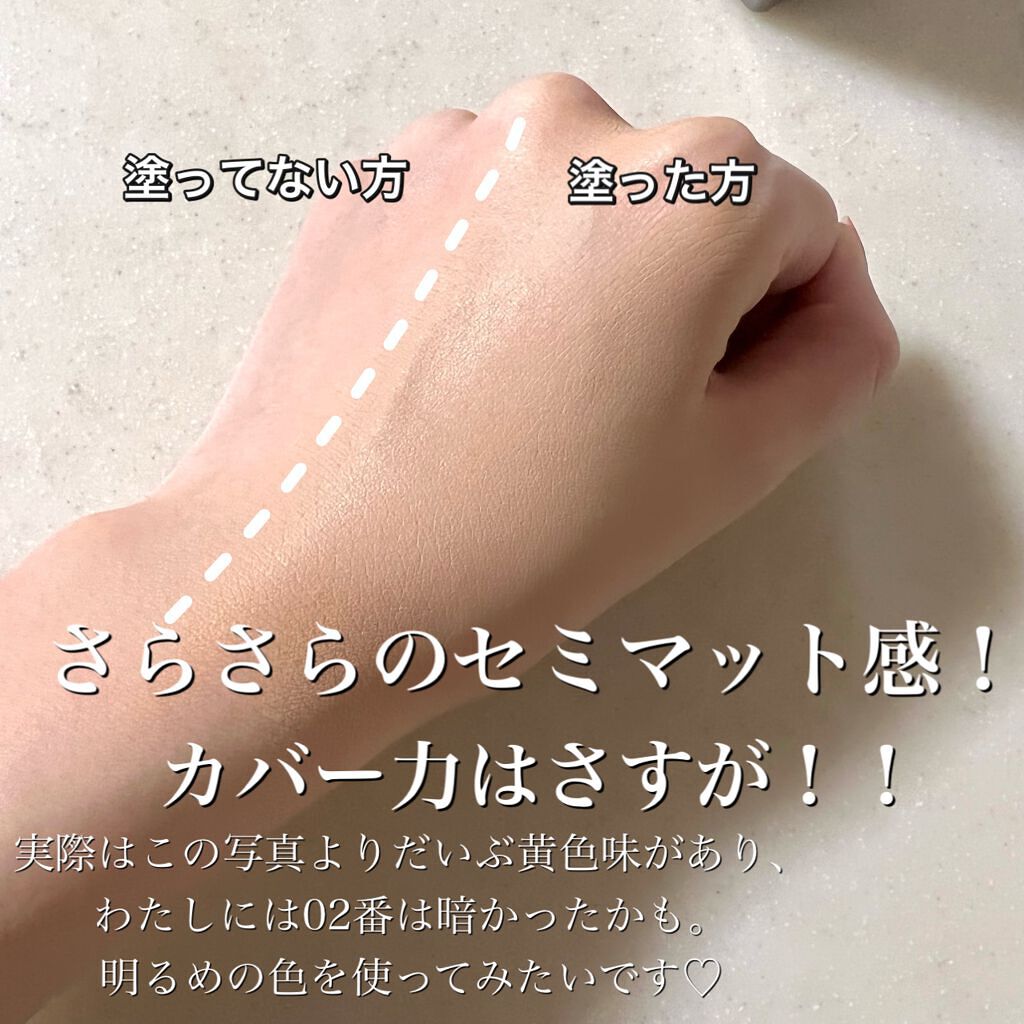 思っていたよりもしっかり色がついてて驚きました🦖💕 伸びが良く、少しの量で顔中に塗ることができます! コスパめっちゃ良い◎ 個人的に一日つけていても崩れにくかったです🤍 素肌が綺麗に見える感じの仕上がりなので わたしのコンプレックスのニキビ跡は 隠れませんでした、、、 軽いつけ心地で時短にもなるので普段使いに おすすめです!✨