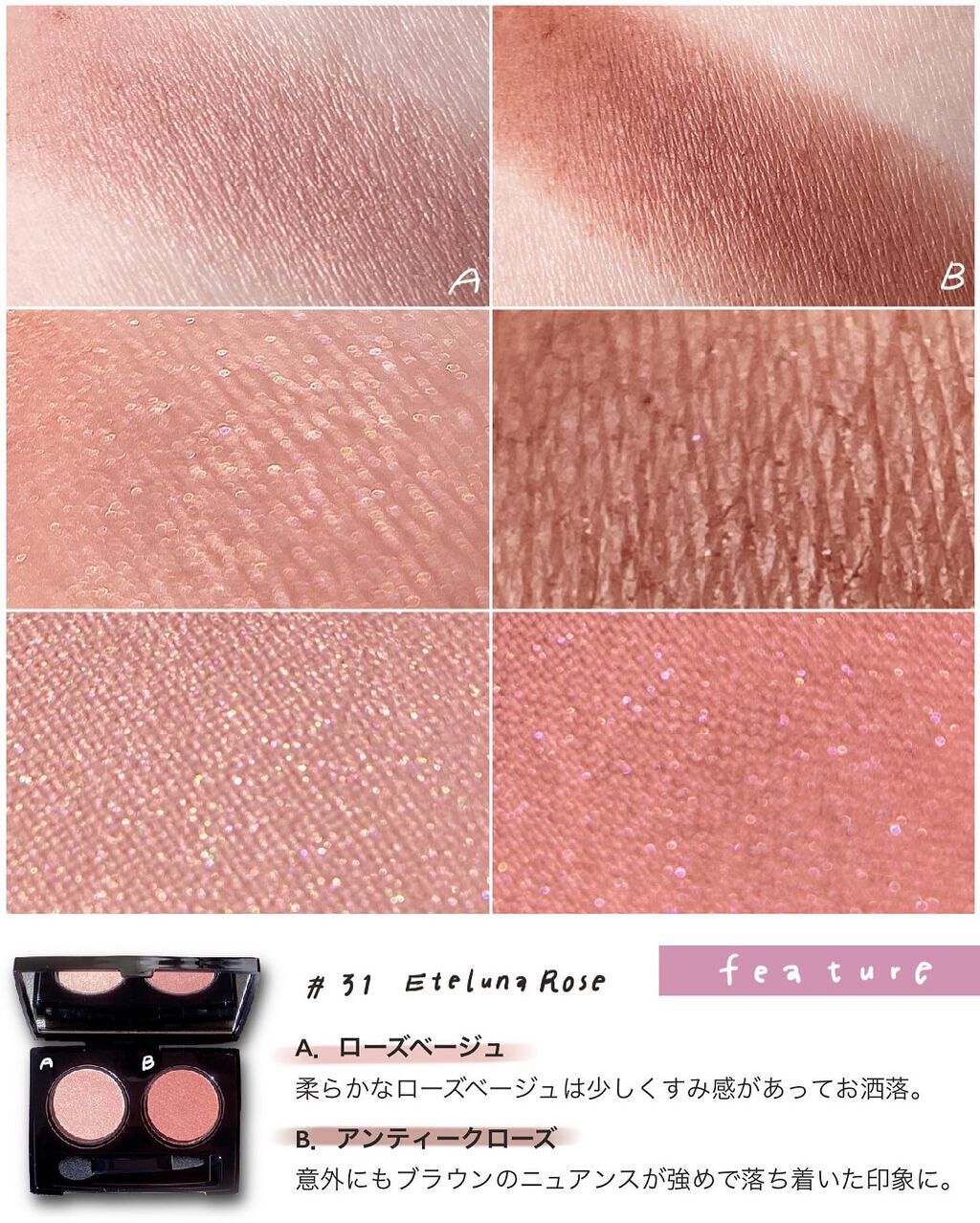 2023年にどどんとリニューアル!全30色展開で新たに発売をスタートしました。 多色パールがこれでもか!ってくらいたっぷり煌めくピンクベージュはほんの少しオレンジのニュアンスも感じられるヘルシーなカラー。 こういうピンクベージュ系の単色シャドウって、ほんとにメイクのベース的に使いやすくて重宝するのよね😚
