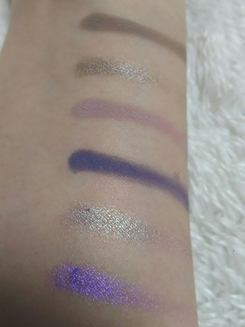 色々なカラーバリエーションがありますが、スタンダードなパレットです。 使いやすい色のセットで、そこまでえげつなく発色するわけではなく、かといって発色しないわけでもないパレットです。 マットの粉はみっしりと詰まっていて、わりとしっかりとした筆じゃないと案外粉が取れないかもしれません。 チップ等が付属していないのはちゃんとした筆を用意してほしいということなのかも……? それはこのキラキラの多色ラメ、粉が緻密で軽すぎて、飛ぶこと…… アイベースを使っていても飛ぶので、結構致命的です。 それでも色はいいし粉もこの値段なら悪くないのでプチプラの中ではおすすめ出来る方です。
