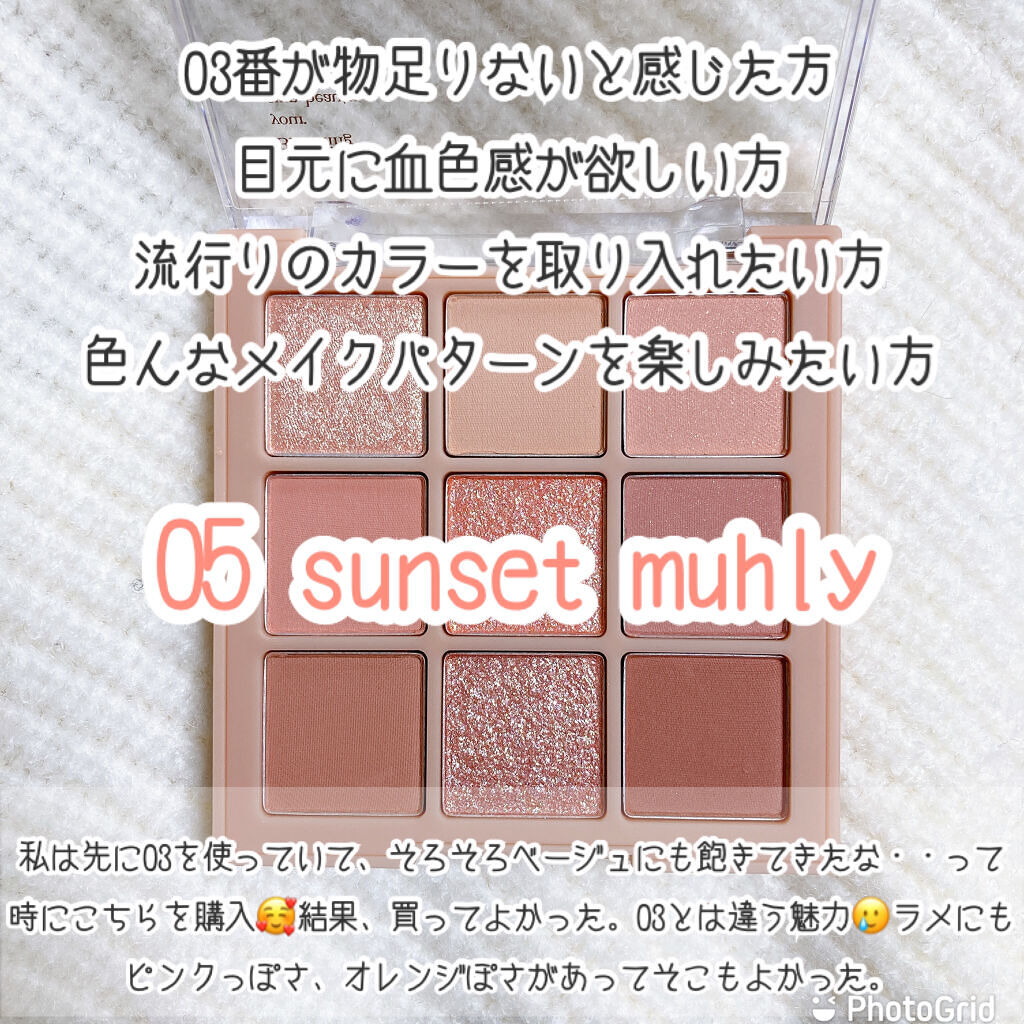 どちらもふんわり優しい発色 03は、ほんとにベージュ!!! いい意味で、チークやリップの邪魔をしない 絶対持っておいて損はないし、 絶対に失敗しない、アイシャドウ❤️ 05は、ふんわり可愛く仕上がる! 03に少し飽きてきて05を購入 05の方がトレンド感もあるし、 ベージュ、ピンク、オレンジぽさもあるから 03と05どちらも持ってるのが1番いい😢