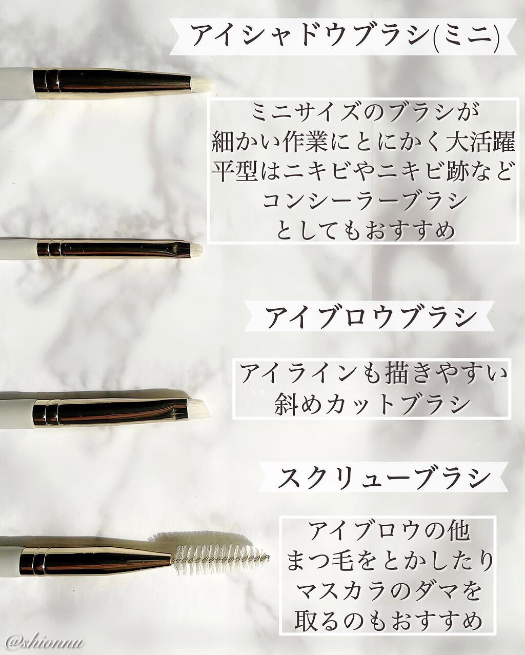 扇形のハイライトブラシで、鼻先や頬の高いところとかにもいれやすい。天然毛で柔らかく、粉含みもいいよ💓 半扇形の斜めブラシで、鼻先にもぴったり!ちょうどいい幅だから使いやすい! どれも1000円前後で買えるし、プチプラだからって、毛質が悪いわけでもないからめちゃくちゃおすすめ💓