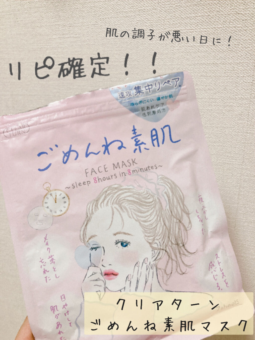 - 【クリアターン ごめんね素肌マスク】 負担をかけて、あれてしまった肌の素肌環境※1をととのえる“速攻集中リペア※2マスク”です。 ① あれがちな肌を素早くコンディションケア! ザクロエキス、桜エキス※3、ウメ果実エキスBG配合し、ゆらぎやすい肌環境をととのえ、肌あれをケアします。また、うるおいケア成分として、ヒアルロン酸、白キクラゲ多糖体BGを配合。外的ストレス※4や不規則な生活の影響を受けやすい肌も健やかでゆらぎにくい肌へみちびきます。 ②敏感肌も使える、弱酸性・低刺激処方 無香料・無着色・無鉱物油・アルコールフリー(エチルアルコール)・パラベンフリー・紫外線吸収剤フリー・シリコーンフリー・パッチテスト済み・アレルギーテスト済み・スティンギングテスト済み・敏感肌自覚者による連用テスト済み(すべての方にアレルギーや皮膚刺激が起きない、刺激感がないというわけではありません。すべての方の肌に合うということではありません。) ③角質ケアもできる!凸凹高密着シート コットン生まれのやわらかな肌触りのベンリーゼを使用。 表面に凸凹のエンボス加工を施しているため、密着性が高く、はがしたマスクでやさしく顔をふきとることで角質ケアもできます。 ※1 うるおい環境のこと ※2 うるおいお手入れのこと ※3 ソメイヨシノ葉エキス、ウメ果実エキスBGはウメ果実エキス・BG(保湿) ※4 乾燥による刺激のこと