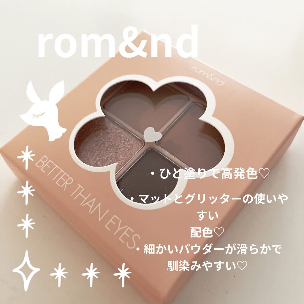 rom&ndベターザンアイズ01ドライマンゴーチューリップ¥1,760〜LIPSショッピングで上位のランキングに入っていて、とても気になっていたので購入してみました☺️フタがしっかりしている◎パッケージが可愛い ◎アイシャドウの中では割と重み...