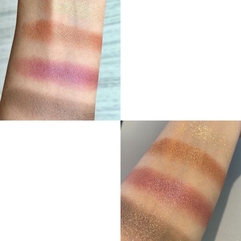 うん、やっぱ可愛い!♡ 神配色👏🏻 今の時期より夏に登場頻度増えそう🙌 ギラギラゴールドがタイプすぎる♡ 左:イエローゴールドシマー ⇒コッパーとゴールドのラメがたっぷり! 大粒ラメがギラギラ夏っぽい 右:シマリングライトピーチ ⇒発色は薄いもののベースや涙袋にだ活躍してくれる ピンクベージュ 左:オレンジ&ゴールデンシマー ⇒ありそうでなかったオレンジカラー オレンジからのゴールドの偏光がたまらない🍊 右:マットパープルレッド ⇒かなり濃いめのパープル!オレンジメイクにアクセントと深みを出してくれる