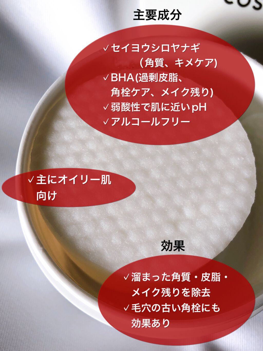 - 1)毛穴の奥の角質、老廃物、皮脂をケアする BHA成分がなめらかに肌のキメを整えます。 2)肌に優しく作用する弱酸性パッド 肌と類似したpHで健康な肌を維持に役立つ弱酸性パッドです。 3)メイクの始まりと終わり クレンジングの際、取れなかった残りを きれいに拭き取り、健康な肌の維持に役立ちます。