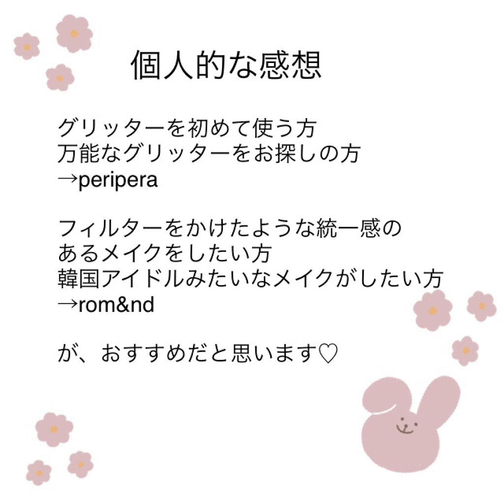 大粒の六角ホログラムがキラキラとしていて綺麗です。 乾くのが早くて、キープ力も強く、水に濡れたりしても安心です。 4色それぞれ色味がはっきりと別れているのでメイクの雰囲気をがっつり揃えたい方や、韓国アイドルみたいなメイクをしたい方にぴったりです♡ rom&ndのグリッターとは異なり、少し水っぽいさらさらとしたテクスチャです。 そのぶん液や位置の微調整がしやすいので初心者さんにもおすすめできます! ベースカラーの色味は、うっすらと感じる程度なので、どんなメイクにも合わせやすい万能グリッターです♡ オーロラホログラムがいいアクセントとなって、こんぺいとうみたいな甘いメイクになります。