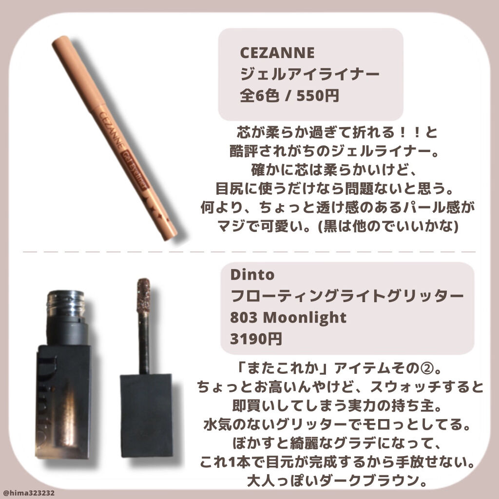 やっぱり見たことある〜🤣 ひまちゃんさっきも言ってたオレンジチークほんとに気になる✨ 最近ひまちゃんと似てきてるのか🤔お金がどんどん無くなる·····💸💸👼 うちのおすすめアイテムはー!!! ♡CEZANNEトーンアップアイシャドウ♡ 安いのに、右のラメ入りレッドが目元をパッ( ・∇・)とオシャレにしてくれる💓 ♡CEZANNEウォータリーティントリップ 03.05♡ 03はひまちゃんにも似合う色!! ベイクハウスとも似合う💕 05はブルベのうちにはグラデがめっちゃしやすくて大人っぽくなれた🤤 ♡キャンメイクマシュマロフィニッシュパウダー〜Abloom〜01♡ 5色が混ざってて開いたら見ただけでメイクする気一気にupするし、単色使いもできるから最高‼️ 最近愛用のお店に再入荷してて即買いした😂 ♡ペリペラSリキッドグリッター01♡ これはうちのアカウントでも投稿してるアイテム💓(見に行って欲しいな·····なんて|ω•̀ )) 大粒ラメと小粒ラメが入っててめっちゃキラキラするし、可愛いのに、、、660円!! ほかの2色も可愛くて全色買いしちゃう可愛さなの!😆 ♡rom&ndべターザンアイズM01ドライアップルブロッサム♡ イエベ向けアイシャドウだけど、こっちも右上の紅葉マット色が可愛すぎて買ってしまった🤦♀️ ブルベのうちでも下地とか気をつければ全然行けた!!! ラメも入ってるパレットでこれあればメイクお直しすぐできる💕 発色良すぎてほぼ毎日使ってた日もある😂😂 こんな感じです!! 長くなりすぎた·····🙄🙄🙄 ごめんね💦💦 でも全部オススメよ〜💕