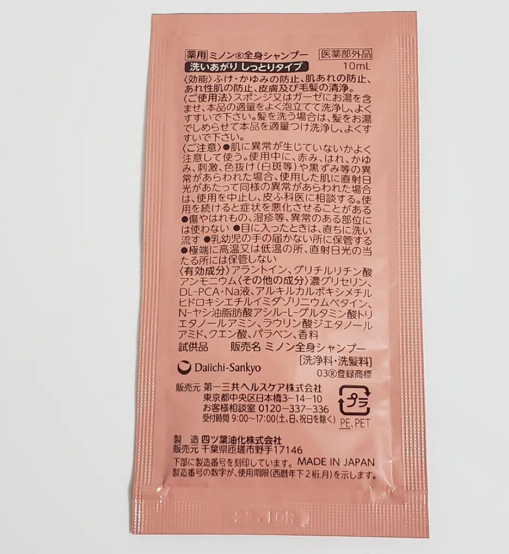 ミノンさんは、よく大量当選のサンプルプレゼントキャンペーンしてくれるので、お試しできて嬉しい。 全身シャンプー。ジェルだし泡立ちはそんなに良くないけど、そこそこの量出せば、泡立ちもそれなりに良かったです。 全身保湿ミルクは、とってもみずみずしくて、柔らかいミルク。シャワーの後にスーッと手早く塗れます。