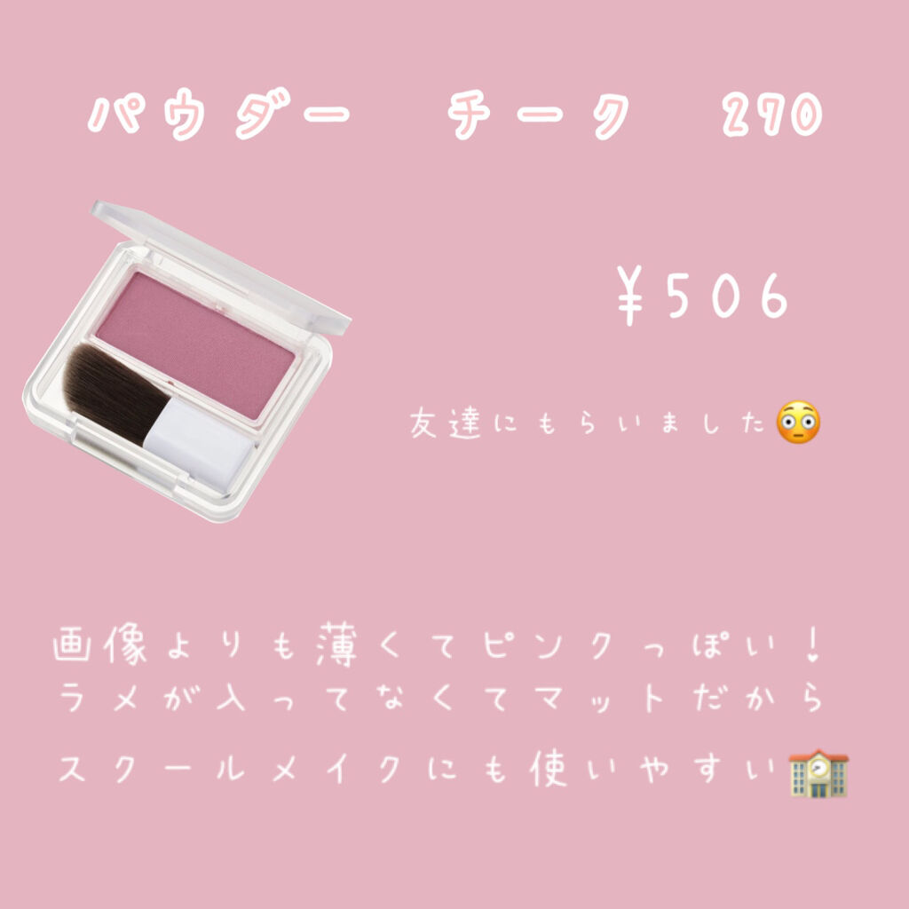 可憐ピンク&ローズチーク🥀 111はグレーみを感じる淡いミルキーピンク🎀 270は鮮やかさのある華やかローズ🌹 単色でも可愛いし、2色重ねても使える! 粉質はサラサラなのでしっとり系が好みの人には不向きかも⚠️ 超プチプラで似合うか分からないカラーにも挑戦しやすい🙌