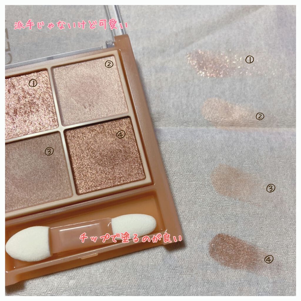 - ラメ・パール・マット3質感の4色アイシャドウ。 肌馴染みの良いベージュを基調としたカラー。ラメ・パール・マットの3質感を重ねて、自然にまぶたを強調し奥行のある大きな目元へ。 しっとり溶け込むような柔らかなパウダーなので、スルスル伸びてまぶたにピタッと密着。保湿成分(スクワラン・ホホバ種子油)配合。