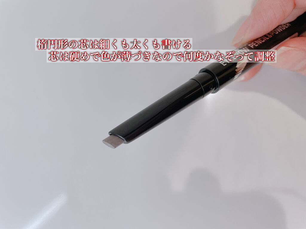 - 細くも太くも自在に描ける楕円ペンシルと、しっかり発色するのにふんわり仕上がるパウダーで、ふんわりこなれ眉が完成するアイテム ●楕円形のペンシルで細太も自由自在 ! 眉頭周辺の眉毛埋めや、眉毛 1本1本の描き足しまで、楕円形の細い・太いを使い分けることで簡単・綺麗に理想の眉が描けます。 ●スルスルとなめらかな描き心地 ! ペンシルにはスルスルとした軽い感触の板状粉体を多く配合しているのに加え、さらにそれをオイルでコーティングしているため、スルスルとしたなめらかな軽い描き心地を実現しています。 ●しっかり発色で簡単美眉に ! ペンシル:配合されている成分の中でも、色素が多く配合されており、また、経時で色がくすむような粉体も少ないため、色素が発色するのをさえぎるものがなくひと塗りでしっかりと発色します。 パウダー:分散性の高い油剤を使用しているため、色素と油が良く混ざり合い、色素が油にまんべんなく濡れるため、しっかりと鮮やかに発色します。また、油剤には肌なじみの良いものを使用しているため、 粉体と肌や眉毛がしっかり密着し、粉落ちするのを防ぎます。 ●無香料