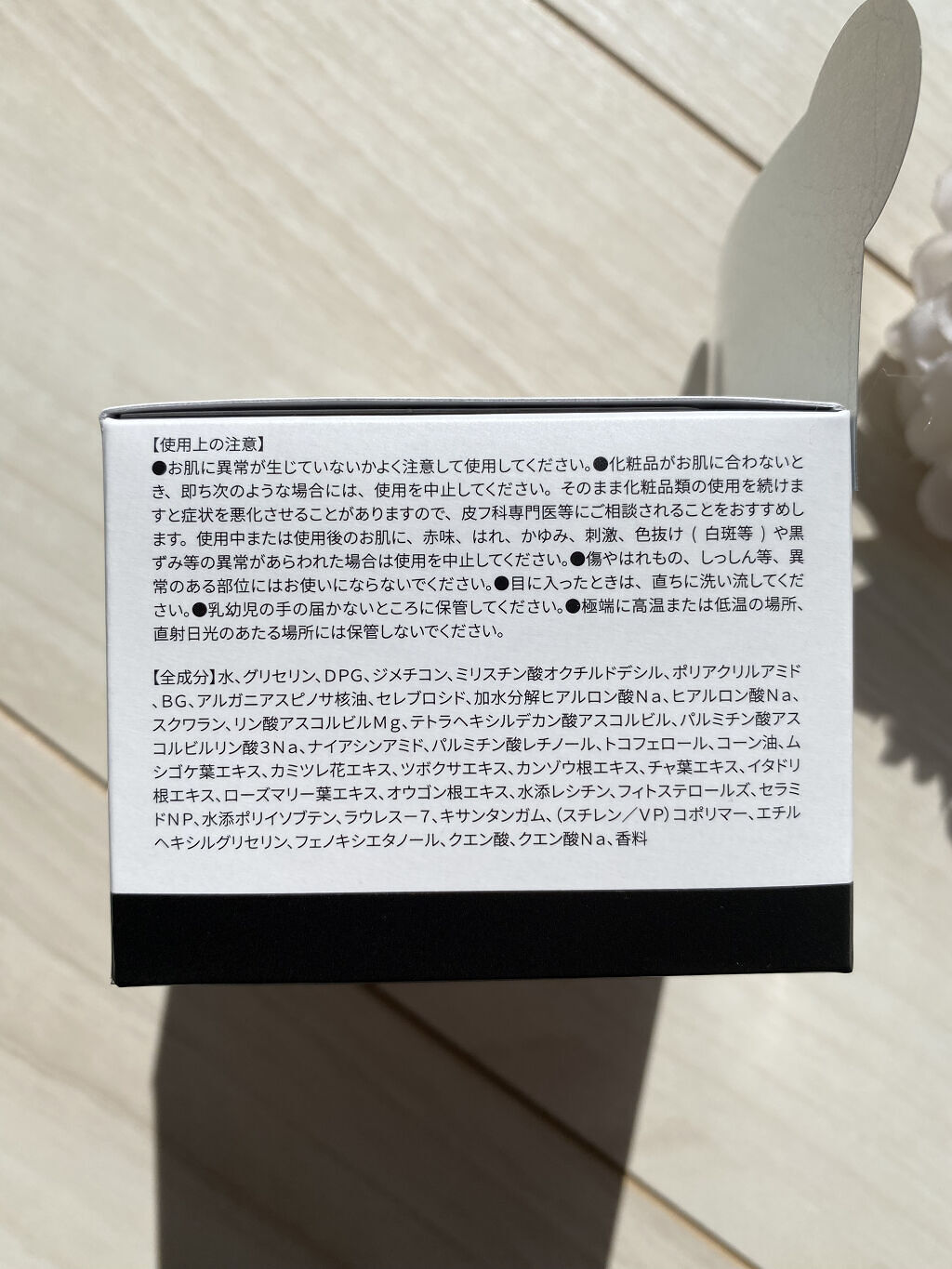 - 水、グリセリン、DPG、ジメチコン、ミリスチン酸オクチルドデシル、ポリアクリルアミド、BG、アルガニアスピノサ核油、セレブロシド、加水分解ヒアルロン酸Na、ヒアルロン酸Na、スクワラン、リン酸アスコルビルMg、テトラヘキシルデカン酸アスコルビル、パルミチン酸アスコルビルリン酸3Na、ナイアシンアミド、パルミチン酸レチノール、トコフェロール、コーン油、ムシゴケ葉エキス、カミツレ花エキス、ツボクサエキス、カンゾウ根エキス、チャ葉エキス、イタドリ根エキス、ローズマリー葉エキス、オウゴン根エキス、水添レシチン、フィトステロールズ、セラミドNP、水添ポリイソブテン、ラウレス-7、キサンタンガム、(スチレン/VP)コポリマー、エチルヘキシルグリセリン、フェノキシエタノール、クエン酸、クエン酸Na、香料