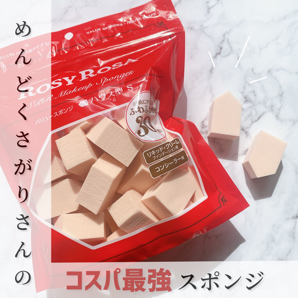 ロージーローザのバリュースポンジN ハウス型タイプS 30Pは、角がたくさんあるので、細かいところから広いところまで、綺麗にメイクできますよ。 さわり心地が気持ちよくて、ふわふわなので、肌にも優しい感じがします! 洗うのめんどいし、毎回綺麗なスポンジでメイクするのがいいので、使い捨てを選んでいます。