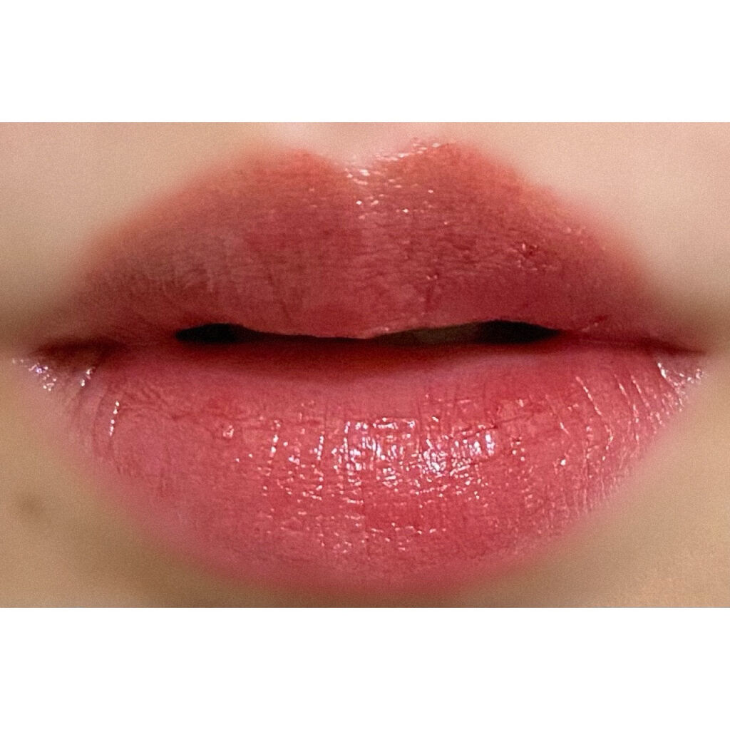 発色は一度塗りだと透け感がある感じで 重ねれば重ねるだけよく発色します。 ツヤ感のあるリップでスルスルと塗れます。 ツヤ仕上がりでティントでもないので 色持ちは喋ってるだけで一瞬で落ちるというわけではないですが 飲食をしたら普通に落ちますし マスクにもつきます。 個人的にこのリップで苦手なのはにおいです。 我慢できないほどではないのですが THE化粧品といいますか マダム感といいますか..