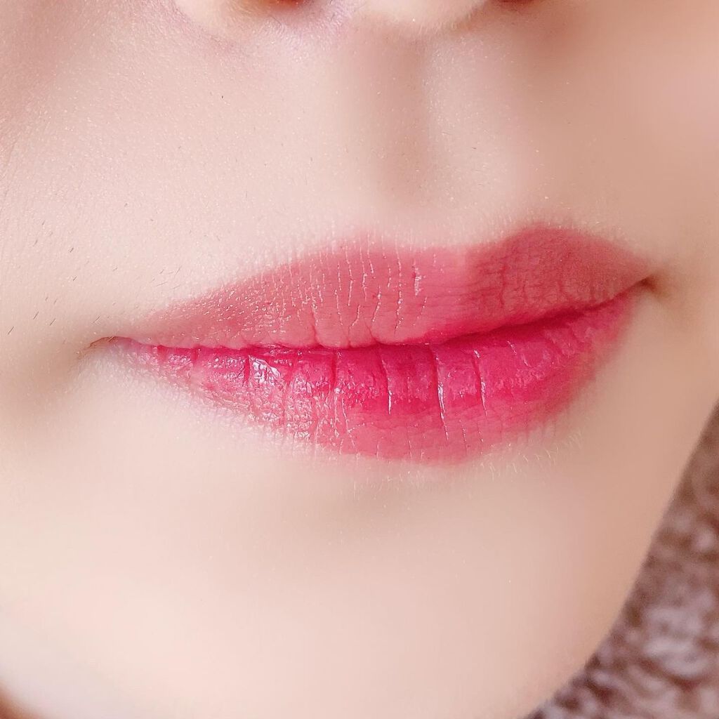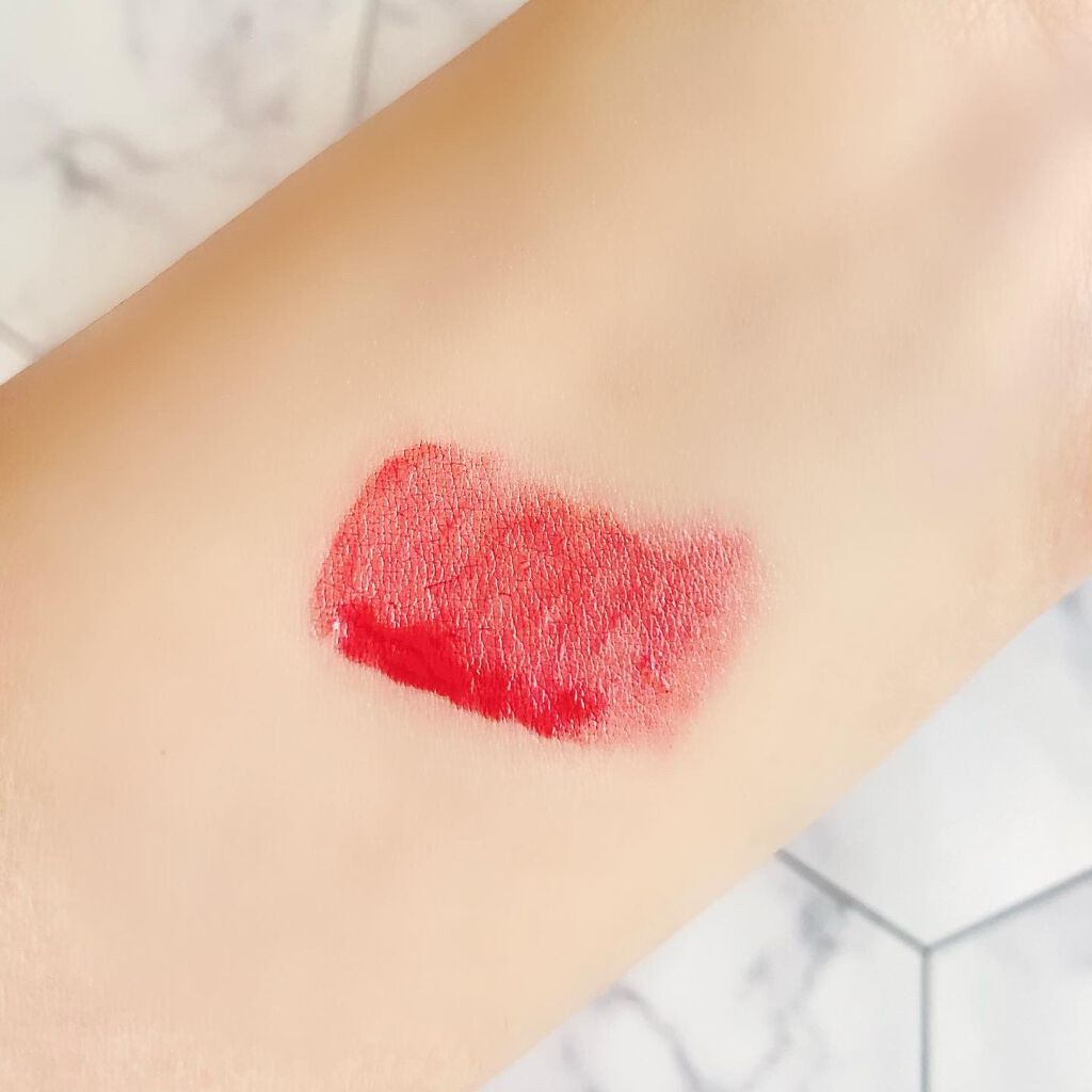 ウォータージェルテクスチャーで長時間にじまないティントとのことで、塗り心地は良く、染まるような発色でした😳 くすみのない明るいレッド系なので、顔色が明るくなって私に合うカラーでした🥰 透け感があると使いやすくて助かります😳