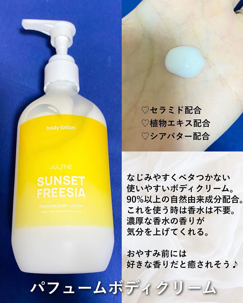 フリージアの香りと甘くみずみずしい梨の香りが作り上げる清楚なフローラルフレグランス 白色の伸びが良いクリームで軽いつけ心地、蓋を開けるとサンセットフリージアがふんわり香ります✨️ 普段は香水の匂いが強くて苦手でつけないから、ケアしながらパフューム効果もある製品は便利🌸