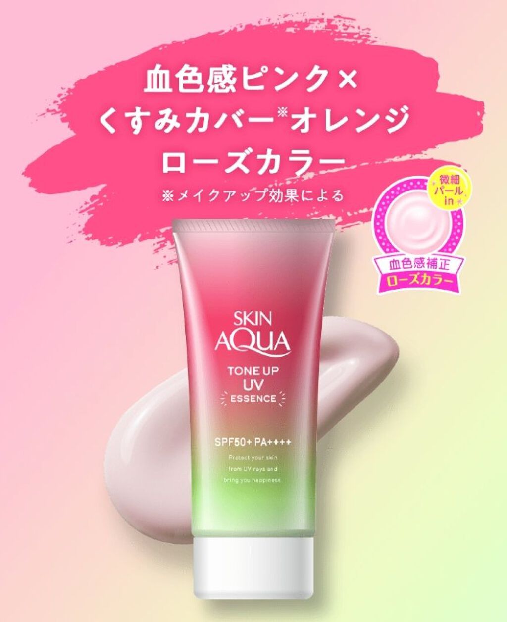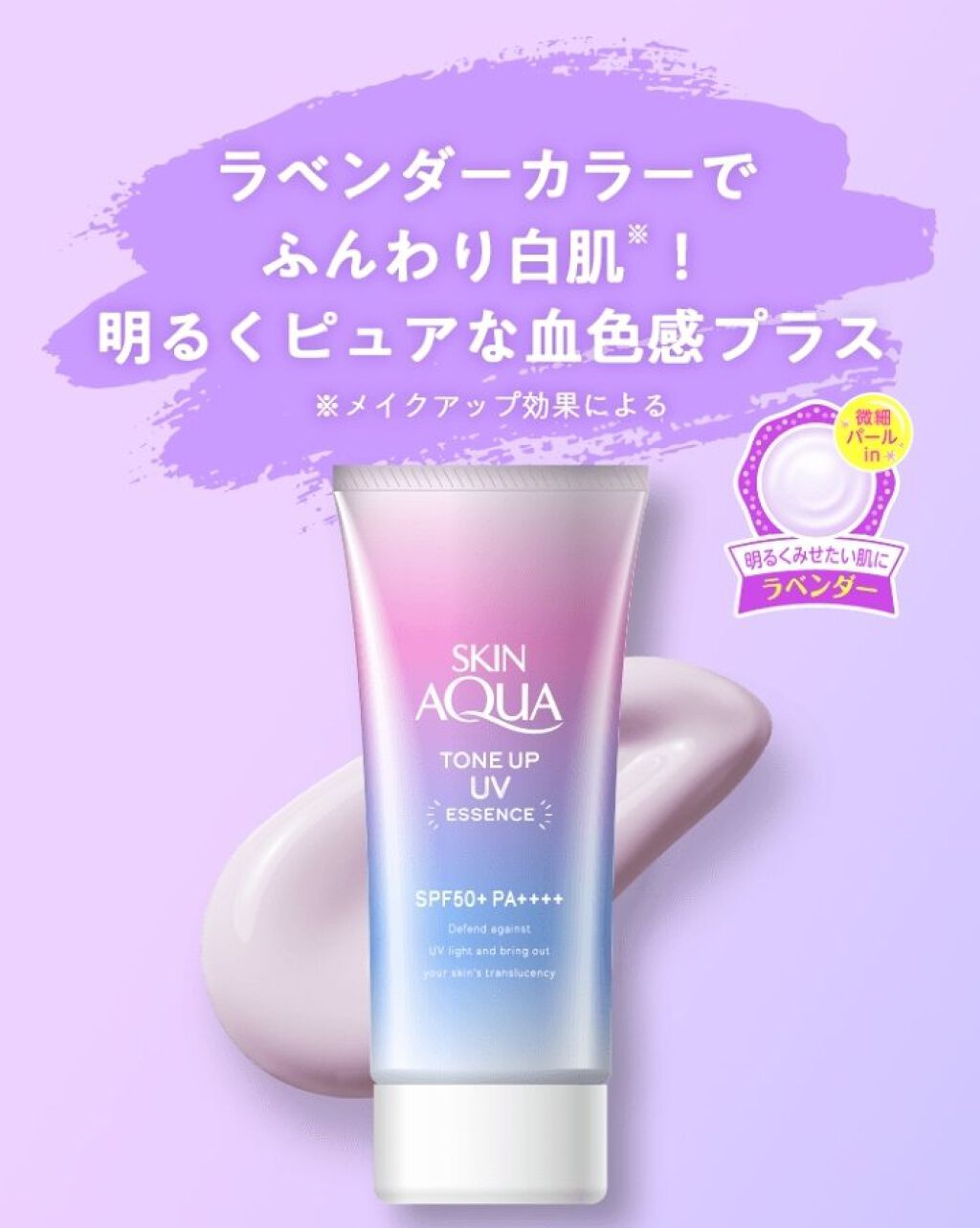 - ※カラー名称「ハピネスオーラ」は「ローズ」へ名称変更となりました。 <ミントグリーン> 赤み補正*1!UVカットしながら、色と光をコントロールし、肌をトーンアップ*1。 ミントグリーンカラーで透き通るような素肌つづく!エッセンスタイプの日焼け止め。 透明感*1のある肌に。 SPF50+、PA++++、UV耐水性★★。 鉱物油フリー。パラベンフリー。ときめくサボンの香り。 <ラベンダー> 明るさ補正*1!UVカットしながら、色と光をコントロールし、肌をトーンアップ*1。 透明感*1を引き出すラベンダーカラーの日焼け止め。 すーっとのびて、みずみずしい使い心地のエッセンスタイプ。 SPF50+、PA++++、UV耐水性★★。 鉱物油フリー。パラベンフリー。ときめくサボンの香り。 <ローズ> 血色感補正*1!UVカットしながら、色と光をコントロールし、肌をトーンアップ*1。 ローズカラーで血色をプラスし、透明感*1のある肌に。 エッセンスタイプの日焼け止め。 SPF50+、PA++++、UV耐水性★★。 パラベンフリー。ハピネスブロッサムの香り。 <ブルー> UVカットしながら、色と光をコントロールし、肌をトーンアップ*1。 血色感を抑えて儚げな色白肌*1に見せるブルーカラーの顔・からだ用日やけ止め。すーっとのびて、みずみずしい使い心地。 透明感ブルー×透明感ホワイト=はかなげブルーカラーで、自分史上最高*2の色白肌*1、うるおう美容液成分(うるおい成分)としてヒアルロン酸Na、ビタミンC誘導体*3配合。 SPF50+/PA++++。こころがときめくサボンの香り。化粧下地にも。石けんで落とせます。 パラベンフリー。鉱物油フリー。アレルギーテスト済み(全ての方にアレルギーが起こらないというわけではありません)。 *1:メイクアップ効果による *2:スキンアクアシリーズにおいて *3:リン酸アスコルビルMg(うるおい成分)