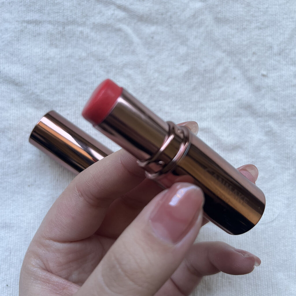 手に出してみると結構赤みが出るんですが唇に塗布してみると名前の通りロゼミルクティーな感じ白みがあるカラーです ティント効果はかなり穏やかだけどなめらかで塗り心地いいから塗り直したくなるリップです