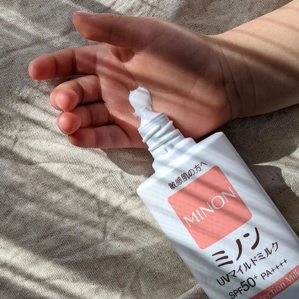 - <ミノンUVマイルドミルク> グリチルリチン酸2K、デカメチルシクロペンタシロキサン、低温焼成酸化亜鉛、パルミチン酸2-エチルヘキシル、微粒子酸化チタン、1,3-ブチレングリコール、メチルシロキサン網状重合体、リンゴ酸ジイソステアリル、グリセリルグルコシド液、メチルポリシロキサン、ポリヒドロキシステアリン酸、オクテニルコハク酸トウモロコシデンプンエステルアルミニウム、ポリオキシエチレン・メチルポリシロキサン共重合体、メチルハイドロジェンポリシロキサン、セスキイソステアリン酸ソルビタン、水酸化アルミニウム、架橋型メチルポリシロキサン、ラウロイルグルタミン酸ジ(コレステリル・ベヘニル・オクチルドデシル)、フェノキシエタノール、セスキオレイン酸ソルビタン、含水ケイ酸、グリコーゲン、コレステロール