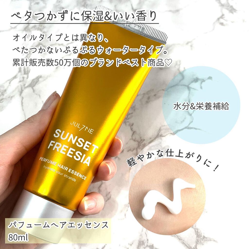 フリージアの香りと甘くみずみずしい梨の香りが作り上げる清楚なフローラルフレグランス 白色の伸びが良いクリームで軽いつけ心地、蓋を開けるとサンセットフリージアがふんわり香ります✨️ 普段は香水の匂いが強くて苦手でつけないから、ケアしながらパフューム効果もある製品は便利🌸