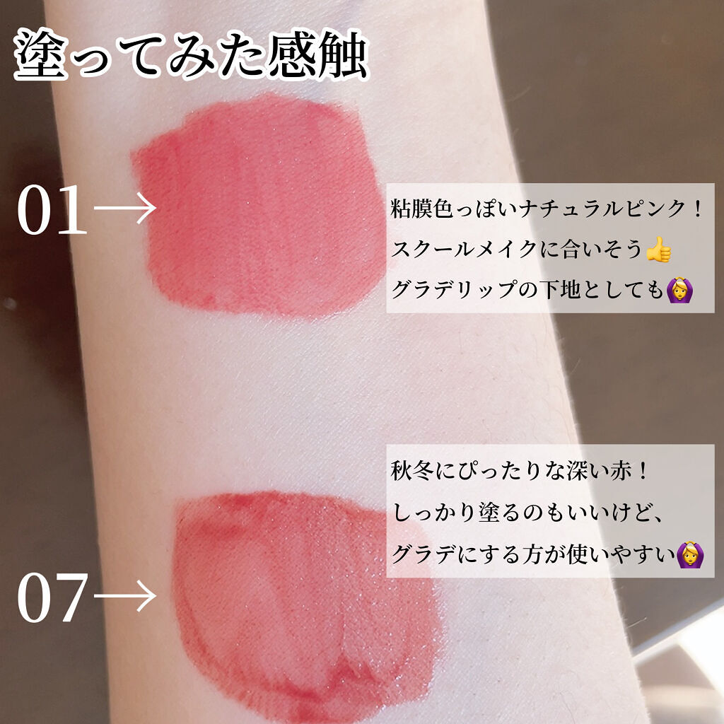 大人気ティントから秋っぽくすみカラーが追加! 3色とも美味しそうな名前がついていてまさに食欲の秋って感じのカラーです😋🍠 やや黄み寄りの落ち着いた深め赤みブラウン 2ndブルベ冬のイエベ秋のナチュラルリップにおすすめ! 色持ちやツヤの持ちはかなりよかった!! 香りがかな〜〜り強烈で長持ちするから強い香料が苦手な人もちょい注意かも🙏🏻