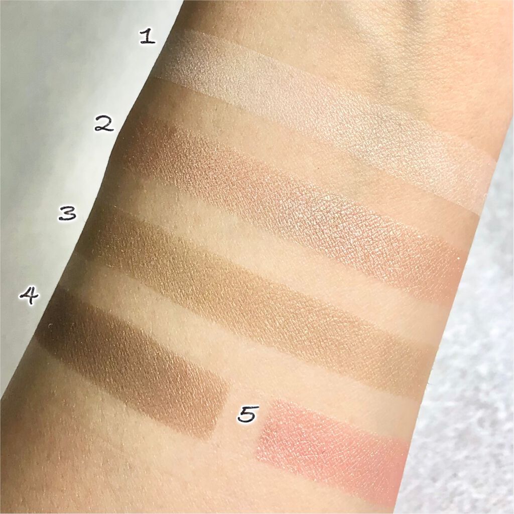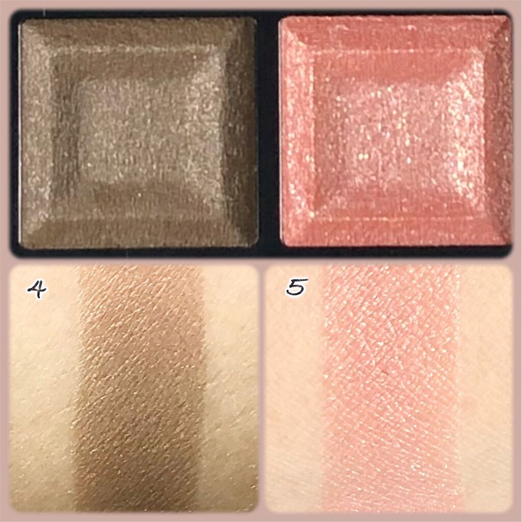 全体的には、名前のとおりヌーディーな印象☺️定番色「01 本命のブラウン」と似てるんだけど、今回の「104 本能のヌードベージュ」の方が、よりヌーディーなカラーとなっておりまする💁🏻♀️ 左上のベージュカラー(1番)は、基本的にはマットカラーなんだけど、ほんのりラメも入ってるから、のっぺりとした印象にならなくて良き🥰 4番のカラーは、ハイライトとして使うこともできるし、個人的には涙袋に使っても良いのではないかと思っておりまする👻 こちらは、全体的にしっとりとしたテクスチャーとなっておりまする💖そして、上2色のマットカラーが、結構しっかり発色してくれます❣️ 右下のハイライトカラーも、「104 本能のヌードベージュ」ほど白っぽくならないので、さりげなくハイライトを入れたい人にピッタリ✨
