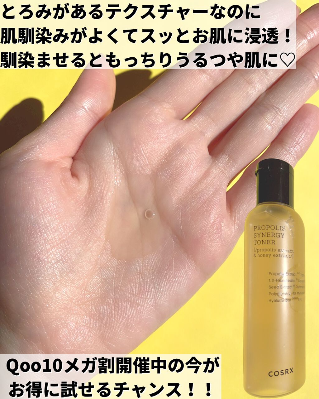 COSRXの特徴といえばプロポリスエキス~🐝 保湿効果や油分と水分のバランスを整える効果が期待できます💡 COSRXを使うと、美容液なしでも もちもちのツヤ肌になれてお気に入りでした🥹 少しとろみのあるテクスチャで2~3回重ねて使うとより保湿感が増されて良い感じです!