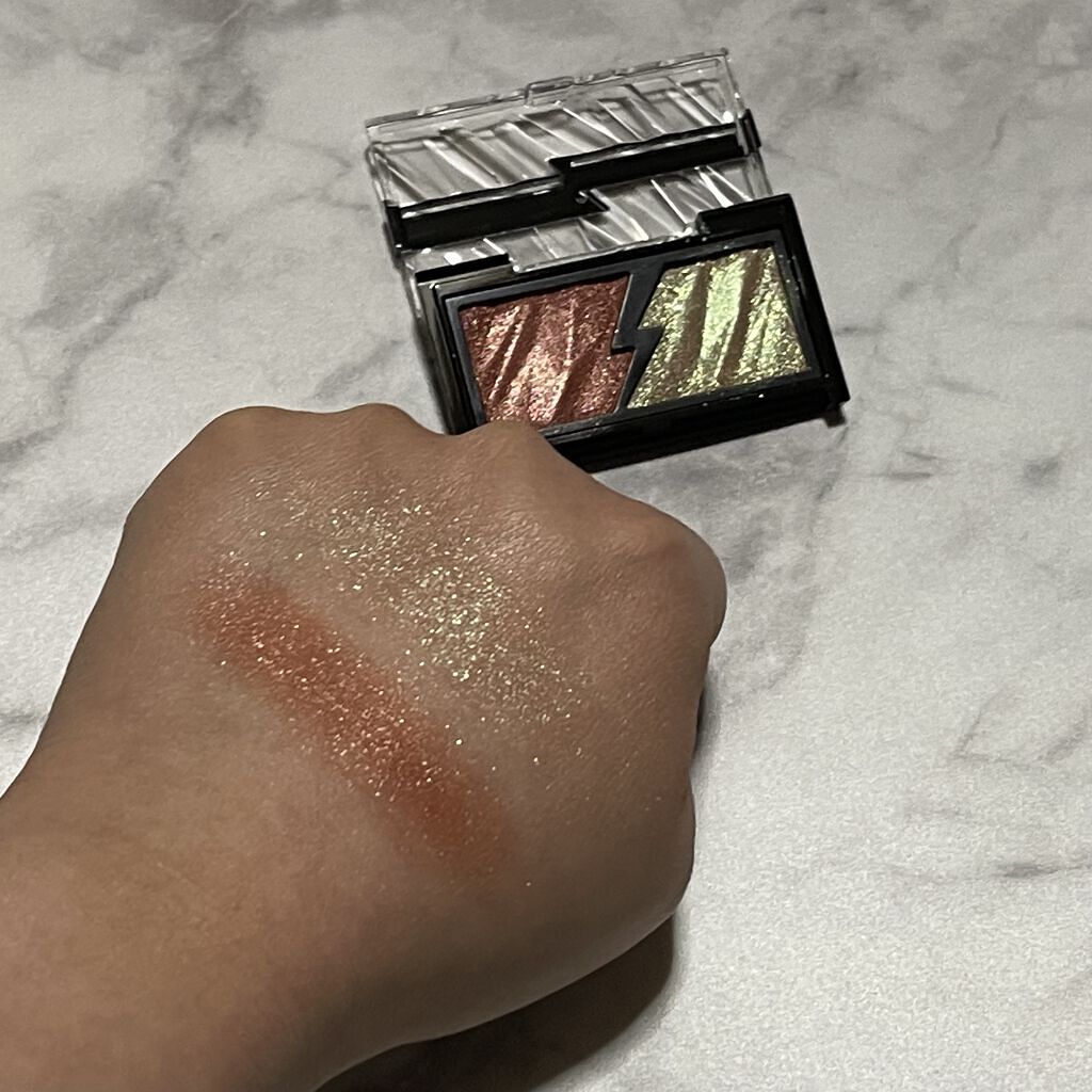 - 質感の違う2つの輝きで火花がクラッシュしたような発光感のある目元印象をつくるアイシャドウ。 まぶたにピタッと密着して、大粒ラメも落ちにくい処方設計。 繊細なカラーパールがきらめくエレクトリカルカラーと存在感のある大粒グリッターでまぶしい輝きを演出するフラッシュグリッターの2つの質感を掛け合わせて、輝き自由自在。 目元以外にも頬や鼻筋のハイライトに使える。