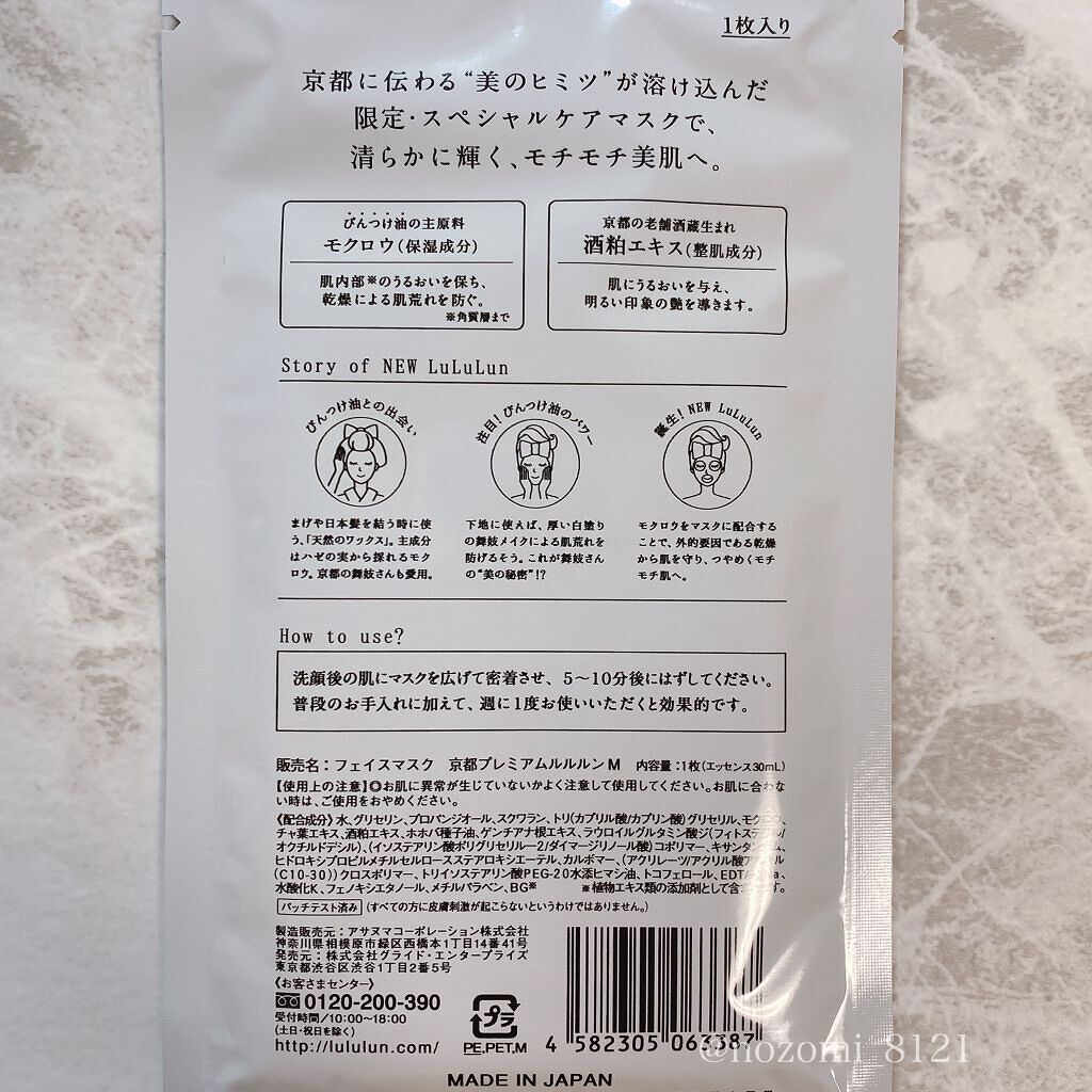 - 京都限定 京都に伝わる美のヒミツが溶け込んだスペシャルケアマスクです。 舞妓さんがまげや日本髪を結う時に使う天然ワックス “びんつけ油” の主成分、モクロウ(保湿成分)や京都老舗酒造生まれの酒粕エキス(整肌成分)を配合。 清らかな輝きを放つ、“舞妓肌” へと導きます。