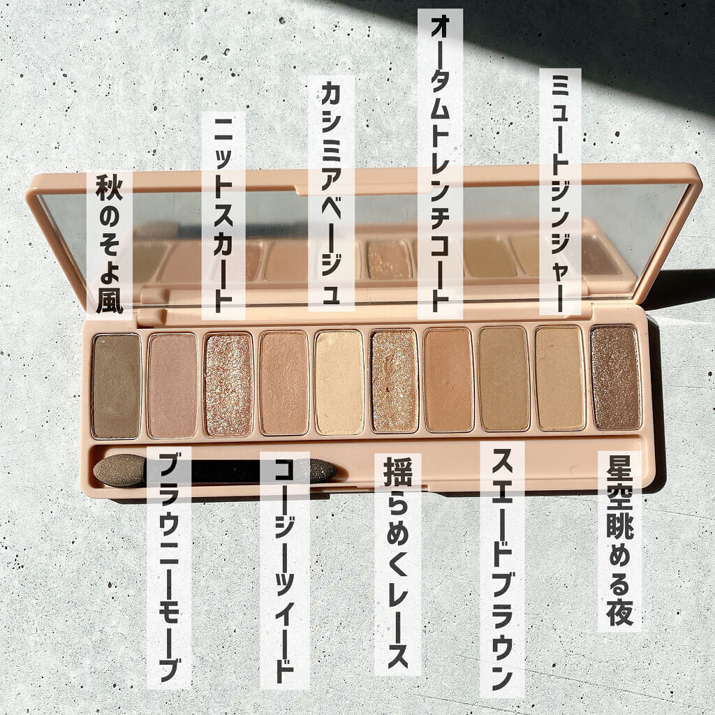 ・秋のクローゼットを意識して作ったという 10色のパレット!組み合わせ次第で、色んな アイメイクが出来ます◎ マットとラメが大体半分ずつになってます。 ・マットカラーは、大人っぽいくすみがかったグレー ジュカラー。色は結構ふんわりと乗る感じです! ・マットカラーの推しは秋のそよ風。 スエードブラウンとグラデーションにしてます! ・ラメはニットスカート、コージーツイード、 揺らめくレースが好き! コージーツイードと揺らめくレースは、 涙袋に使うことが多いです✨