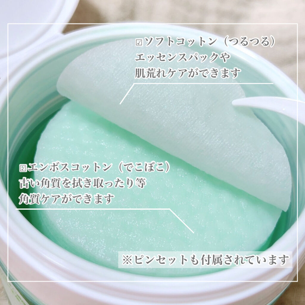 - 肌荒れを予防するティーツリーエッセンス(ティーツリー葉水、ティーツリー葉エキス、ティーツリー葉油の3種類を整肌成分として)を、コットン100%の肌に優しい使い心地のパッドに贅沢にたっぷり配合しております。 片面はエンボスコットン、もう片面がソフトコットンになった「デュアルパッド」になっており、用途に応じての使い分けが可能です。エンボスコットンの面は、手軽に角質・毛穴汚れをオフできる拭き取り化粧水としてお使いいただけます。ソフトコットンの面は、乾燥が気になる部分、肌荒れ予防や集中ケアしたい部分のポイントパックとしてお使いいただけます。 ※2022年9月以降パッケージリニューアル。