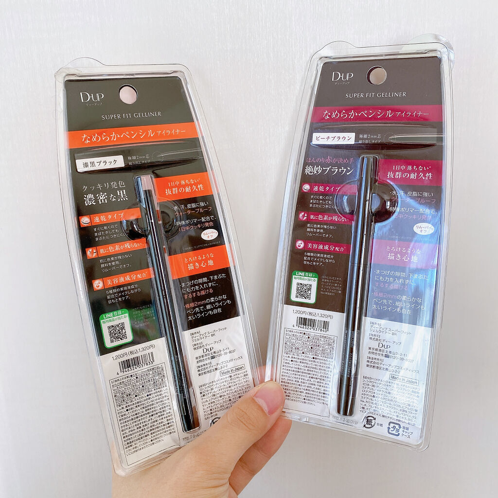 するする書ける繰り出しタイプのジェルライナーです 使用感はとてもよく、落ちにくくてさすがD-UPと思いました! 色味はピーチブラウンなのですが、ほんのり赤みを感じるかなという感じで、結構ブラウンブラック寄りで、ピーチ感は感じませんでした。