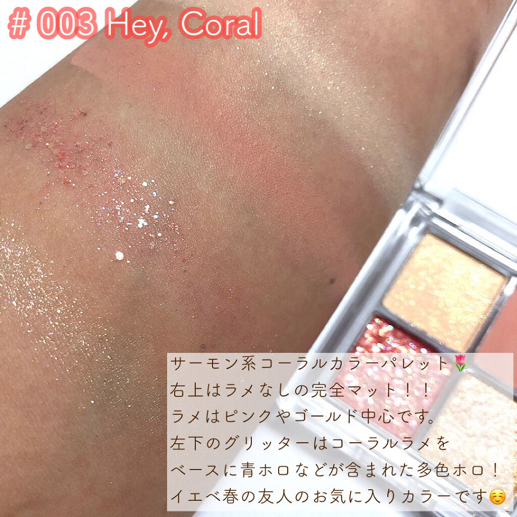 このアイシャドウパレット全体を通して言えることは、陰影の付けやすさを重要視して作られているのでとにかく陰影がつくりやすい! マットシャドウは高発色、高密着でとにかく粉質が良い。 ラメは上品なシマーからド派手な六角ホログラムまで、色々なテクスチャーが集まっているのでとにかく楽しい! ホログラムはブラシだとほぼつかないので、指でとってぬることをおすすめします。 テクスチャーはどれもワセリンを含んだかのようにしっとりとしているので、ラメ飛びせずまぶたにしっかりと密着!! 温かみのあるコーラルカラーが集まっており、イエベ春の私大歓喜😂 デイリーメイクからギラギラのパーティーメイクまで多彩に楽しめるブラウンパレット。 絶妙なローズピンクカラーが集まったお上品仕上がりなアイシャドウパレット。 彩度0なグレイッシュカラーが集まったマットシャドウパレット。 陰影が簡単に作れるまろやかなヌードブラウンが集まったアイシャドウパレット, 彩度低めの優しいミュートピンクカラーが集まったパレット💜