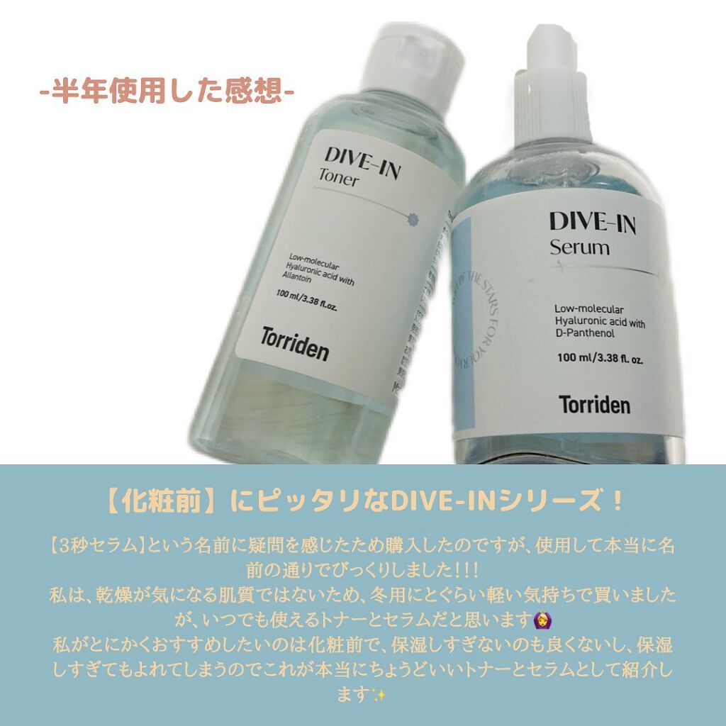 ⚪︎torriden DIVE-IN トナー300ml ¥2,310(税込)2021年のファへビューティーアワードで1位を獲得した優秀なトナーです✨※ファへとは、韓国版アットコスメのような口コミサイトのことです水のようにしゃばしゃばとしたテクスチャーにもかかわらず、スッと肌になじんで保湿してくれる優れものです!! ⚪︎torriden DIVE-IN セラム50ml ¥2,420(税込)こちらもファへで3年連続1位を獲得している優秀セラムで【3秒セラム】とも呼ばれています!!セラムはトナーではないので、そこまで水のようなテクスチャーではないのにもかかわらず、3秒と言われているようにスッと肌になじみます!ベタつきもなく、保湿してくれる優秀セラム✨ 化粧前に乾燥したくないけど、保湿でベタついているものを使ってヨレたくないという方に本当におすすめしたいです!!
