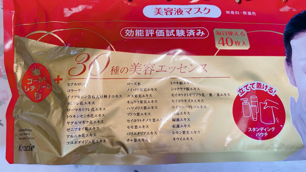 - リニューアル発売 ・化粧水、美容液、パック、アイゾーンマスクの4役が1枚になった乾燥小じわを目立たなくする全顔用シートマスク。 ・30種類の美容エッセンス。 ・浸透型ゴールドレチノールEx配合。 ・天然コットン100%の肌あたりの柔らかいシートマスク。
