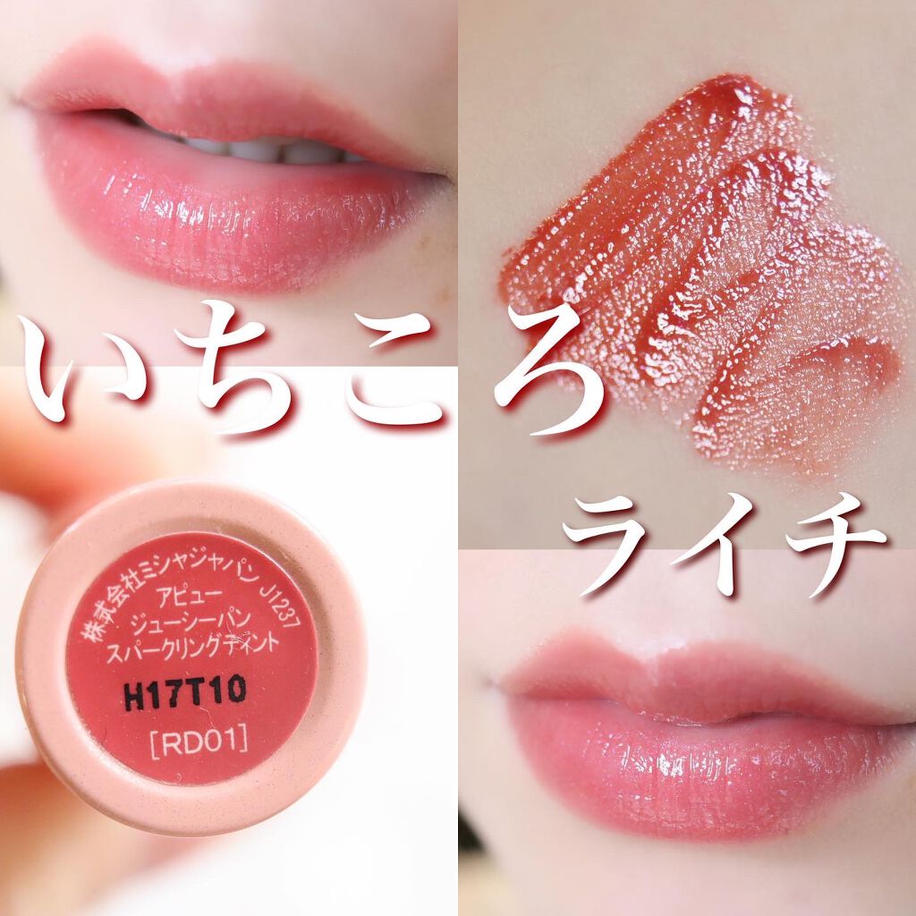 ❤️A'pieuジューシーパンスパークリングティントRD01 いちころライチ❤️見たままの発色でディープなブラウンレッドです🍎✨ジュエリーパウダー配合でキラキラとしたラメ感と綺麗なツヤ感が楽しめます😊💓唇に塗ると落ちにくいですが、クレンジング...