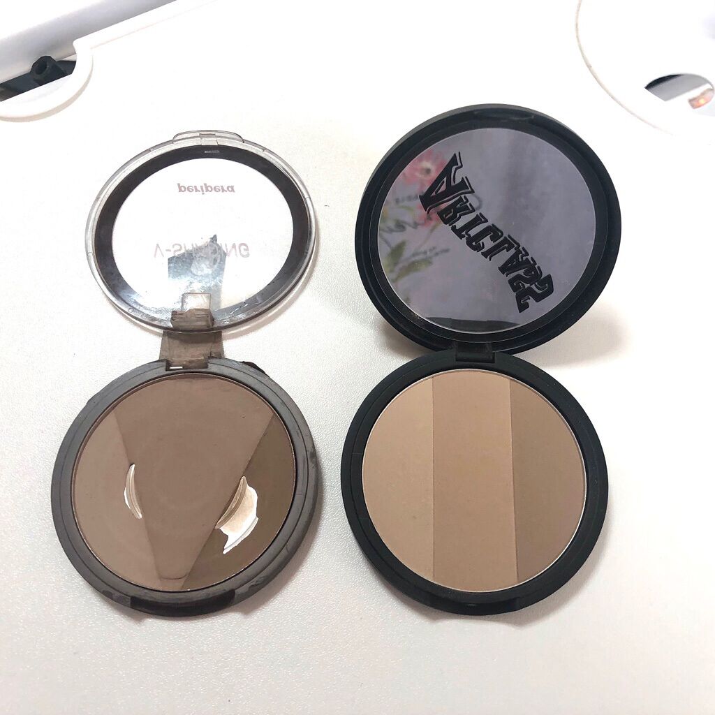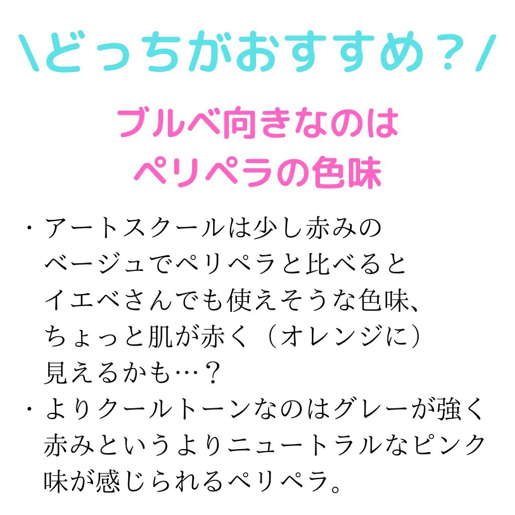 わたし自身ブルベでオレンジ味やイエロー味が強いものは土塗った?(笑)みたいになって激しく浮くので、シェーディングは出来るだけブルーベース向け、クールトーン向けのものを使っています! ノーズシェーディングだと個人的に色味が合ってないのがなんとなく分かりやすいので特に気になる… 最近はシェーディングひとつとってもグレー系やブルベ向きなどバリエーションがありとても助かってます🥺 アートクラスの方がベージュ味が強くわたしの肌では赤っぽくなり、ペリペラのグレー味のものと比べるとちょっと違う…むしろイエベさんでも無理なく使えそうな色! たしかにペリペラもピンク味があって完全にグレーって訳ではないのですが、イエベよりのピンクじゃなくてニュートラルな暗いピンクなので顔色が悪くならないためのほんのりしたピンク味であって、そこが違う…!