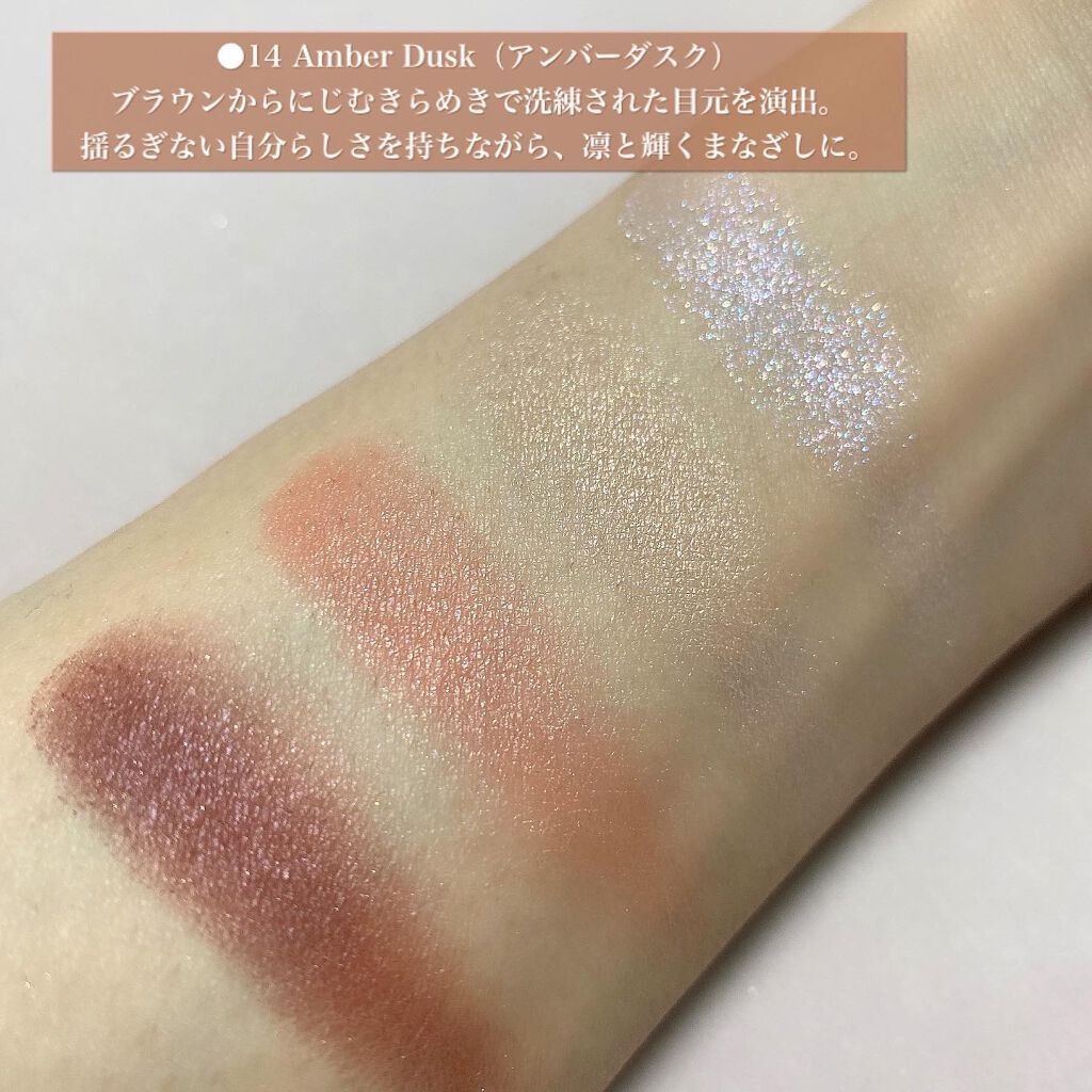 今回は、LUNASOL(ルナソル)から、ブルベさんも使えるコーラルパレットが登場💕透明感満載の、「アイカラーレーション14:アンバーダスク」をご紹介していきたいと思います!!✨ 今回私が購入した#アイカラーレーション14#AmberDusk のパレットは、今回「気持ち」を色彩で表現されているので、なかなかイメージが沸かなかったのですが、ブルベさんも扱いやすい、青みコーラル~くすみピンクの仕上がり感に、シアーな水色のグリッターが透明感を添える、今までに有りそうで無かった美しくもデイリーに使いやすい配色😳💕 淡い色と色を繊細なニュアンスで重ねていくのが、今春のトレンドなのか、全体的に淡い発色で締め色も、かなり淡く優しい発色の為、濃いアイメイク好きさんには物足りない…😂😂😂ピンクやボルドーなどの「カラーライナー」と合わせて使うと、とってもお洒落で可愛く仕上がりました◎