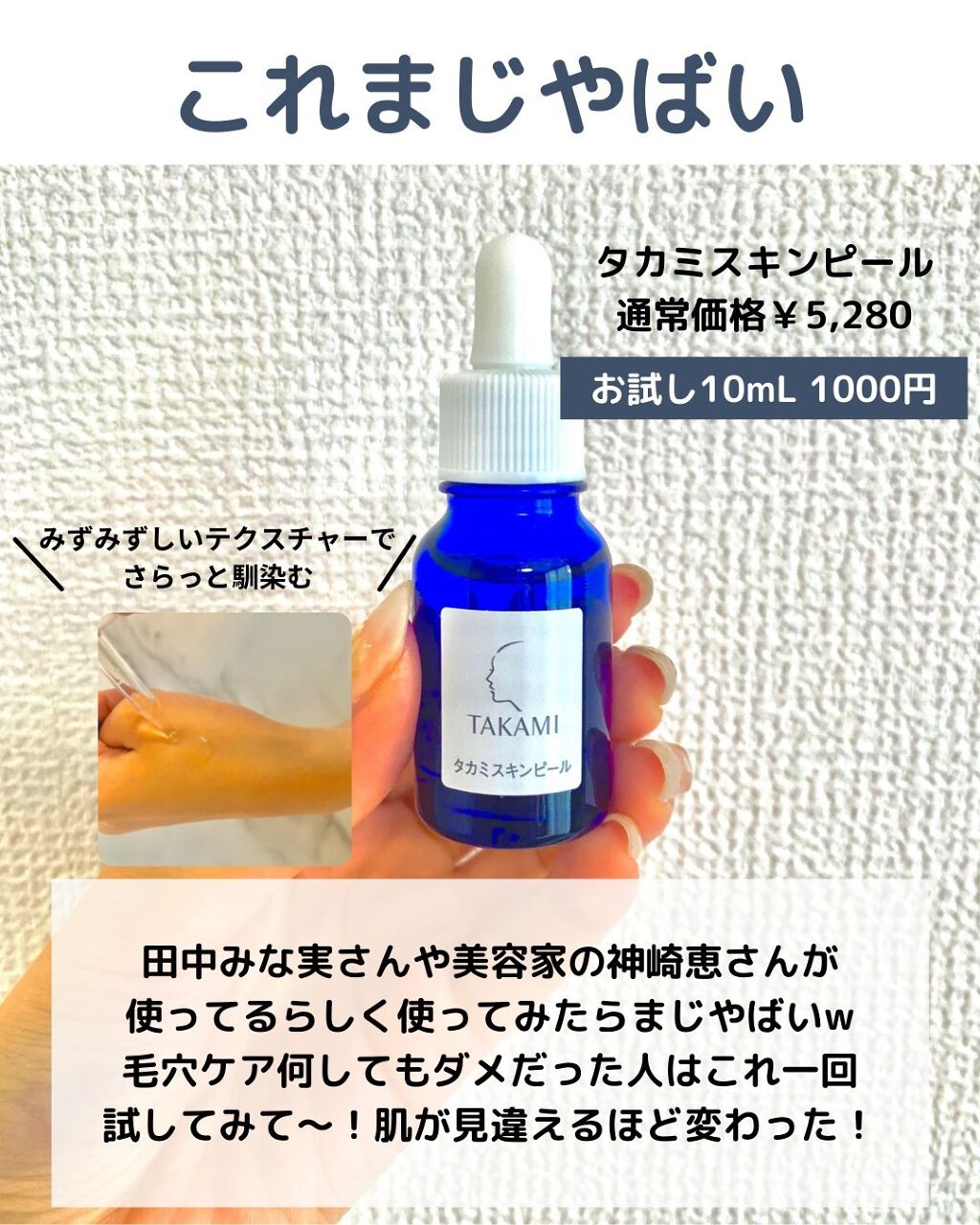 肌のポツポツ悩みに効くアイテム5選をご紹介!☺ 中でもおすすめなのがタカミスキンピール! キレイな人が使ってるイメージのタカミスキンピール。 2021年ベスコスにも選ばれてめちゃくちゃバズってる美容液。 結果、早く使っておけば良かった!! 私みたいに敏感肌さんにこそ使って欲しい、角質ケアアイテム! 肌に馴染ませることによって、肌の生まれ変わりに寄り添ってくれる。 お肌は28日周期で変わるみたいなんだけどここがずれると肌荒れが起こるみたい。 本当に水みたいな使用感で、肌荒れ部分につけても一切刺激を感じない! 一度で効果を実感するわけではなく、使い続けることによって肌が明るく、きめが整ってくる感じ。使えば使うほど好きになる。