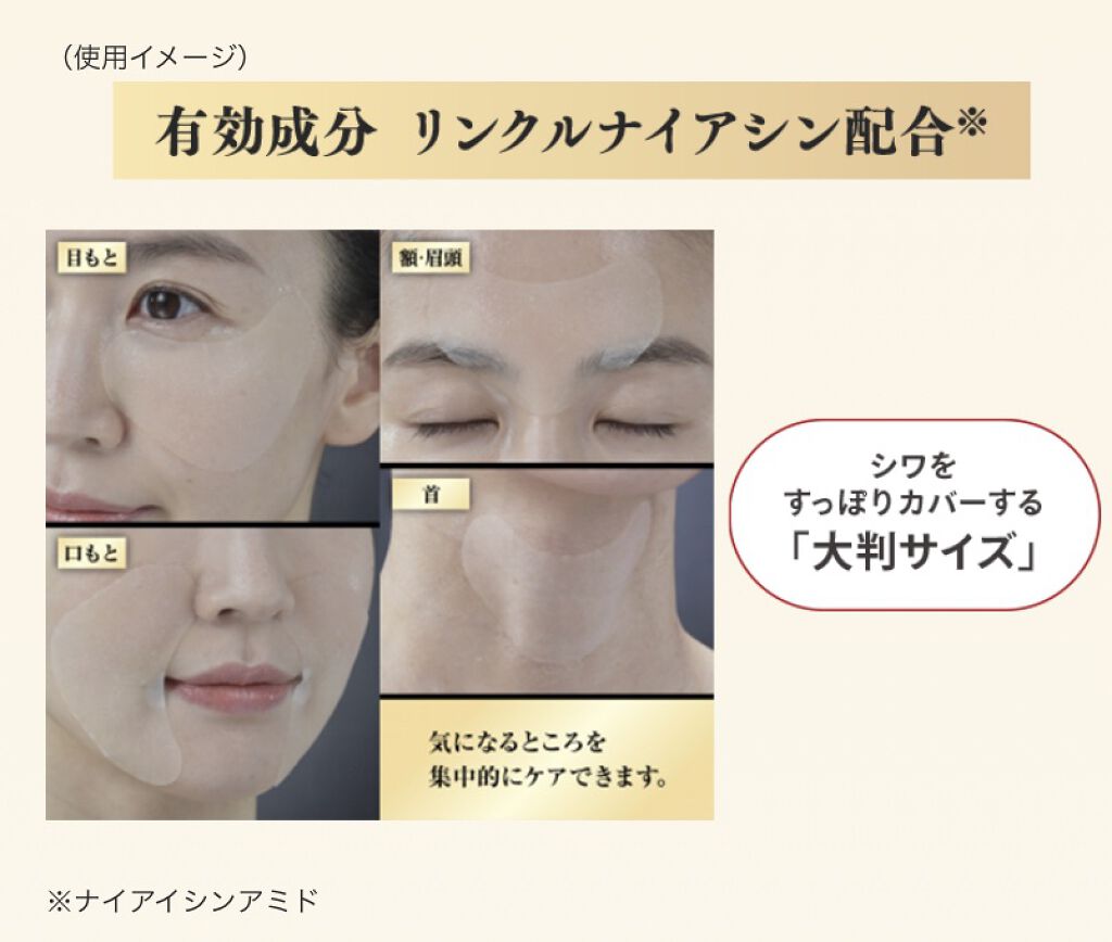 - シワを改善する部分用マスク。 表情が現れやすい目もと・口もとをはじめとするシワに、有効成分が表皮・真皮まで深く効果を発揮。内側からわきあがるような輝くツヤ肌へ。