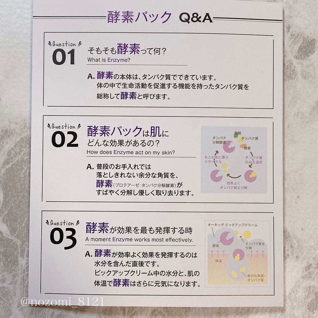 - 酵素の働きで古い角質を穏やかな使い心地で落とすパックです。くすみ*をケアし、お肌のキメを整え、透明感のある肌に導きます。 計量いらずの普通肌1 回分の使い切り分包タイプです。 *古い角質や汚れによる
