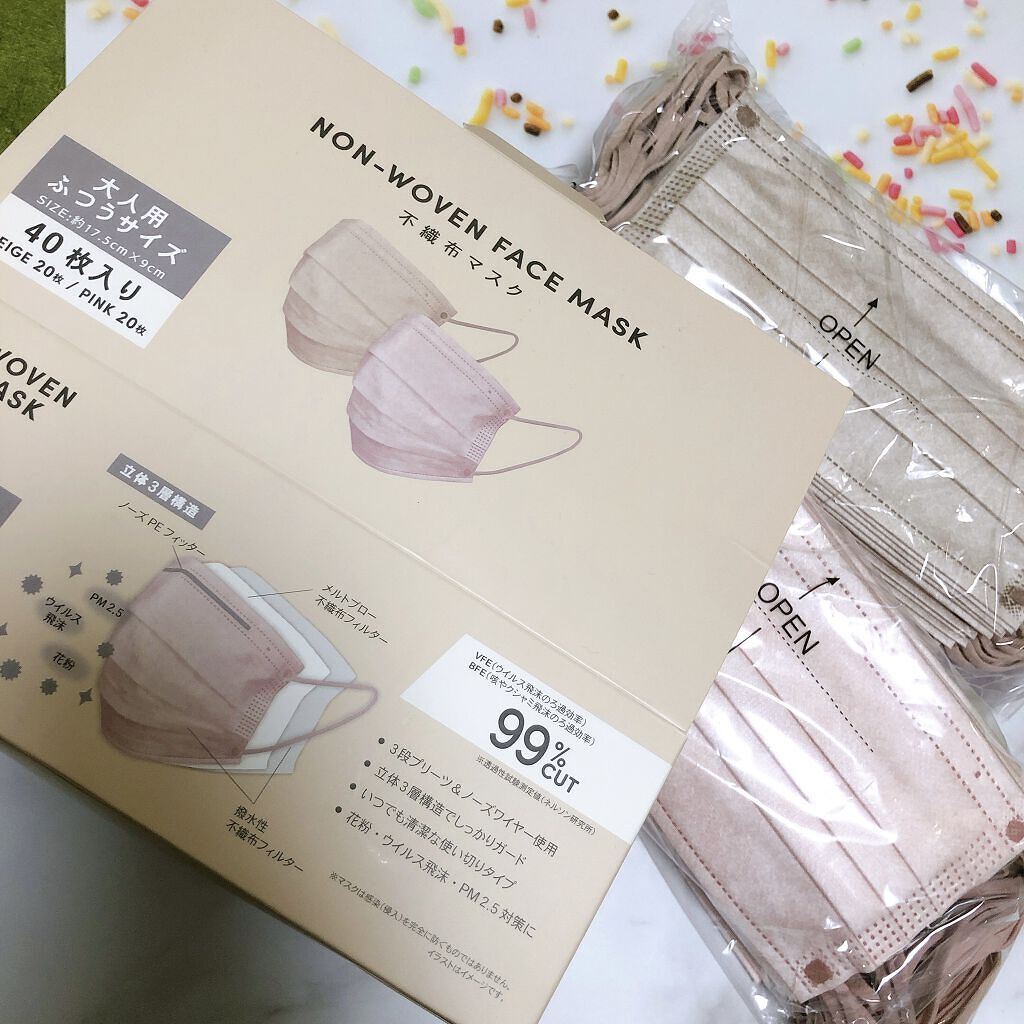 3COINSから発売されている不織布マスクです。お値段はもちろん330円と、コスパが最高です! 3段プリーツ&ノーズワイヤー使用 立体構造で飛沫や花粉をしっかりガード VFE(ウイルス飛沫のろ過効率)&BFE(咳やクシャミ飛沫のろ過率)99%カットと記載がありますので、 安心して使えるマスクだと思います。 カラーはお肌馴染みのいい「ピンク×ベージュ」と、性別を問わず使える「グレー×ホワイト」の組み合わせです。 今回はホワイトが欲しかったので「グレー×ホワイト」を購入しましたが、断然「ピンク×ベージュ」がめっちゃ可愛い!
