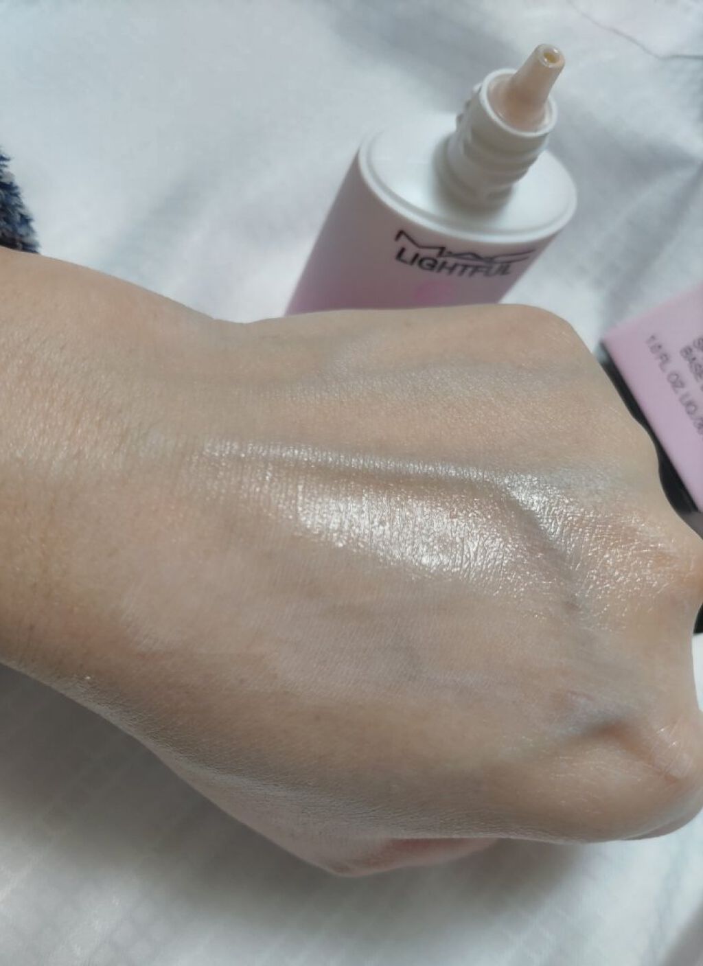 保湿感・ツヤ感・密着感◎ 【M・A・C/ライトフル C+ティンティッド プライマーSPF45】 緩めのテクスチャーで伸びが良いです◎ SPF45/PA+++++で紫外線対策もできてオススメ👾 保湿感があり、乾燥を感じにくくてお気に入り🫶🏻 ツヤ感が出て綺麗な仕上がりイメージ