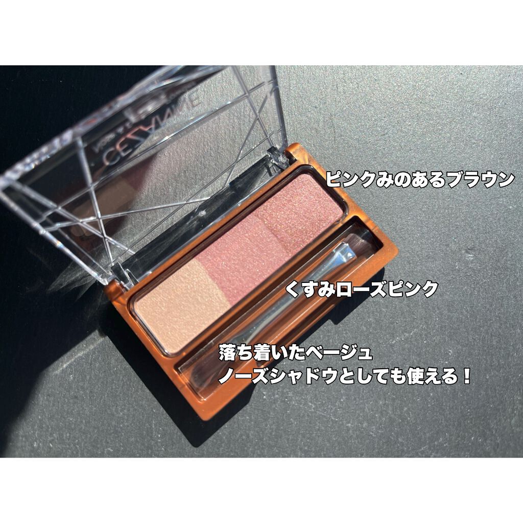 彫り深&ふんわり立体眉で目元の印象アップ。 ノーズシャドウにも使える、3色グラデーションのパウダータイプ。 しっとり粉質! とってもしっとりとした粉質で、肌にピタッと密着してくれます! これが個人的イチオシカラー! 赤みがあるピンクブラウンパレットで、アイシャドウに使ってもとっても可愛い!