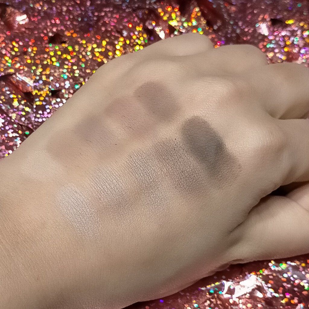 全部ラメ!キラキラ好き大歓喜のパレット😍😍😍 左下2色のグリッターはしっとりぺたぺたしている質感で瞼にしっかりくっついてくれます! ざっくり言うと上段はキラキラ中段はツヤツヤ下段はギラギラというイメージです。 全体的に色づきは控えめでラメ感を楽しめる🥳 全部キラッキラの宝石みたいな多色ラメですが、上段は青ラメ、中段はピンクラメ、下段はゴールドラメが目立つなーと思いました💖 名前も可愛い☁